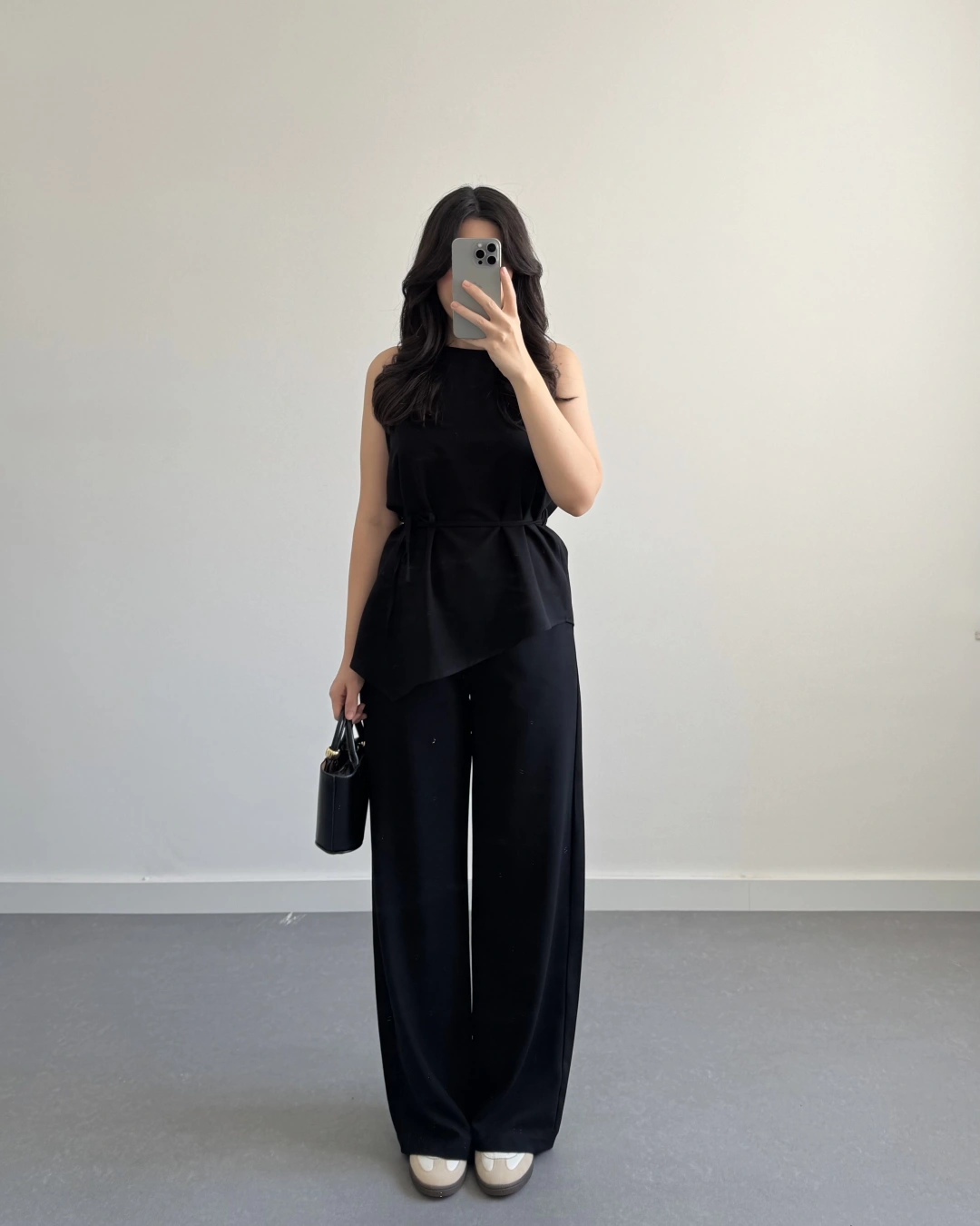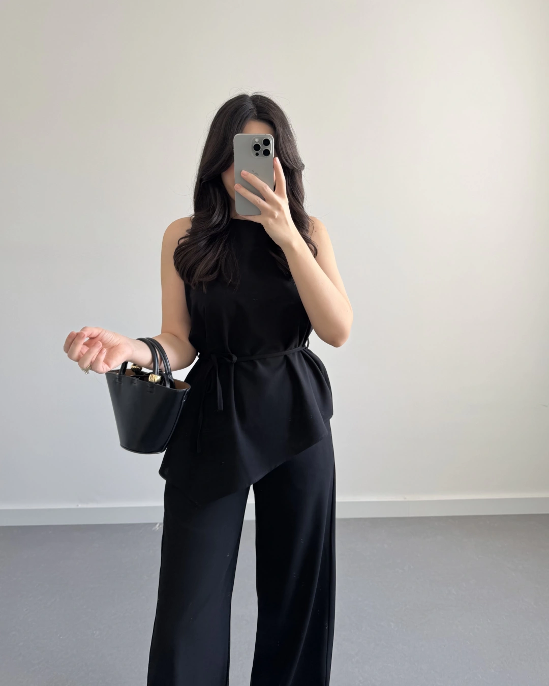 SİYAH BELİ KUŞAKLI PİLELİ MODAL TAKIM