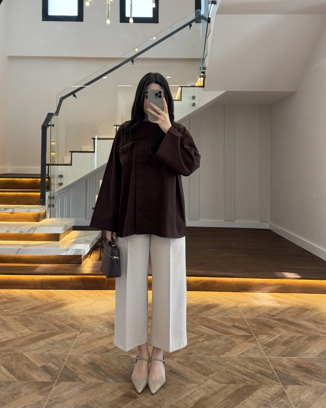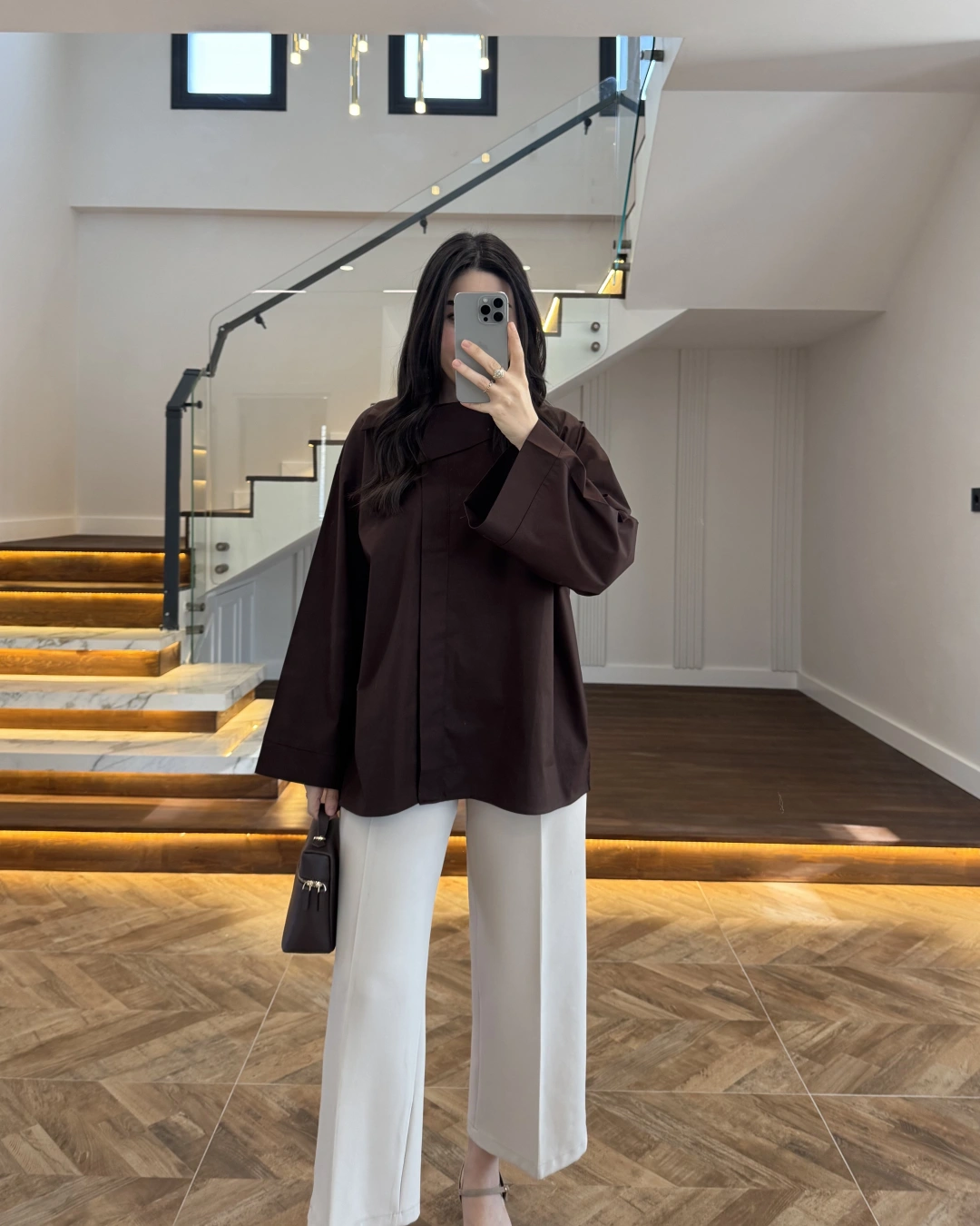ASİMETRİK YAKA POPLİN GÖMLEK KAHVE -5419