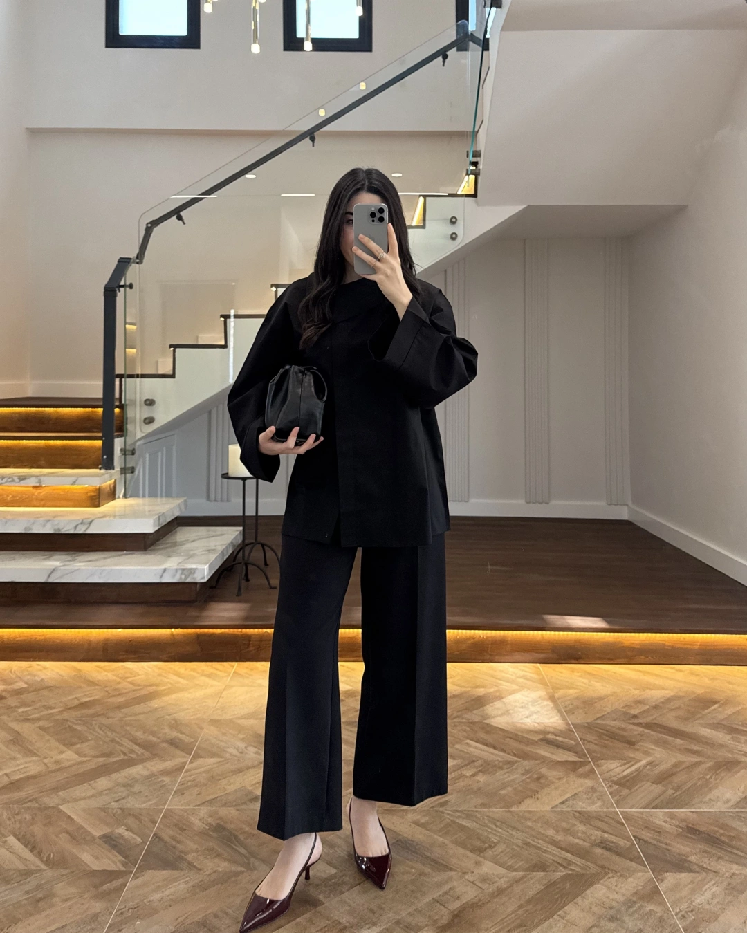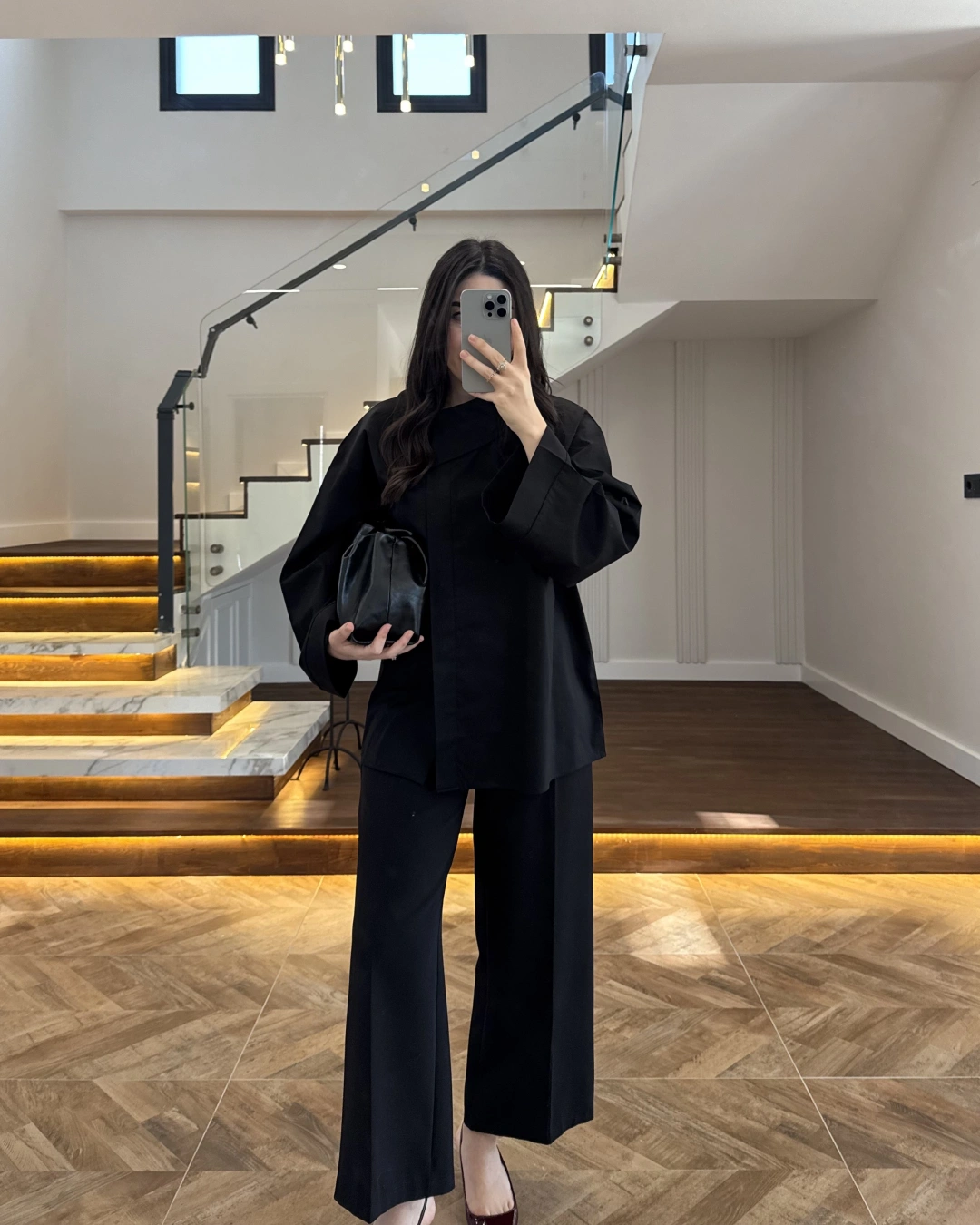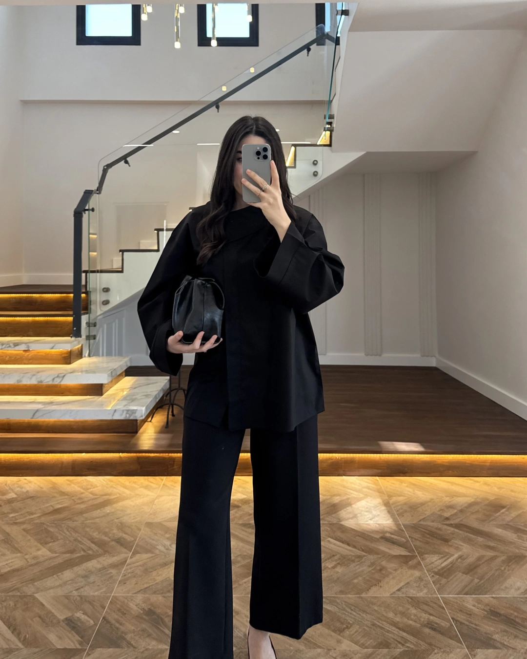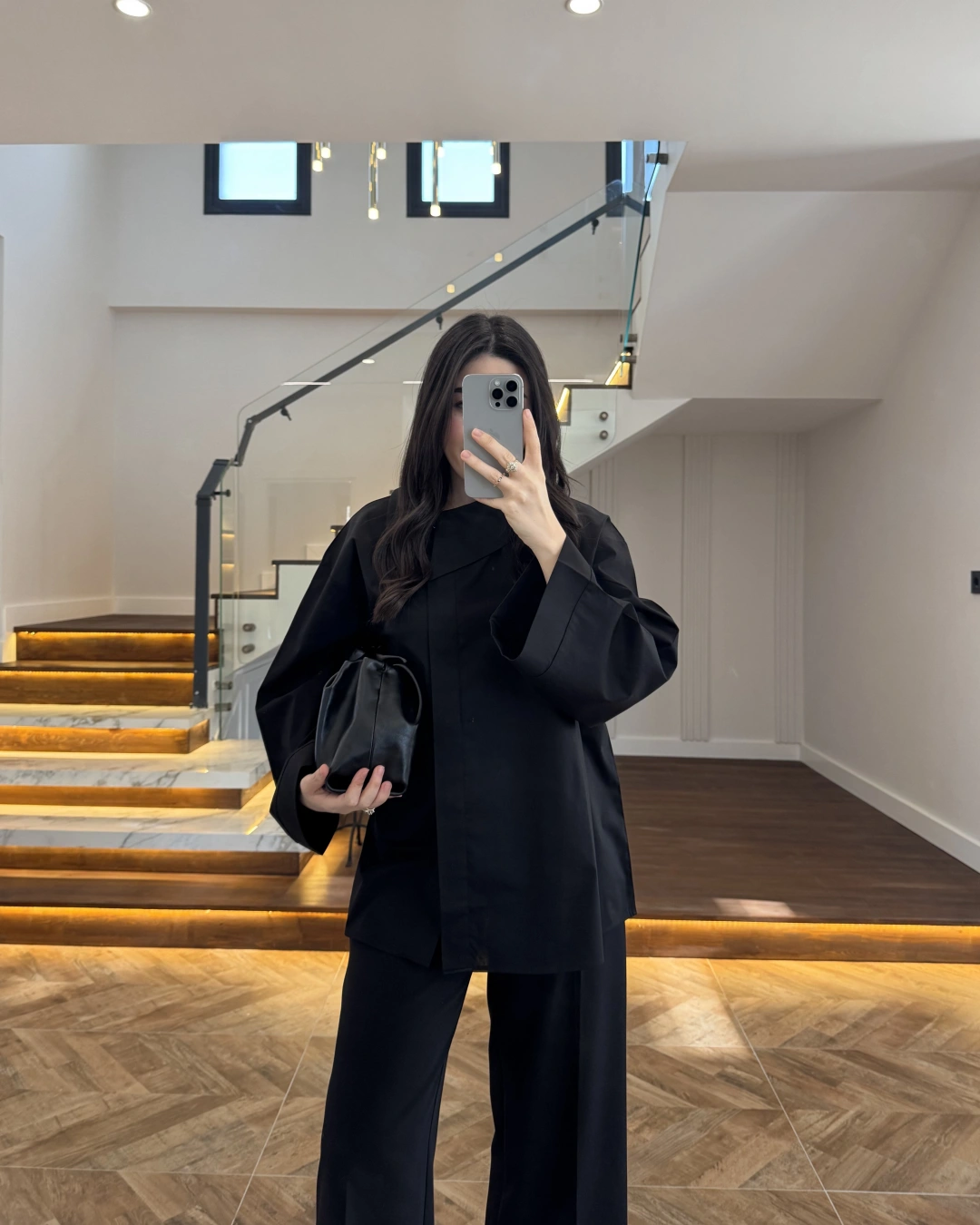 ASİMETRİK YAKA POPLİN GÖMLEK SİYAH -5419