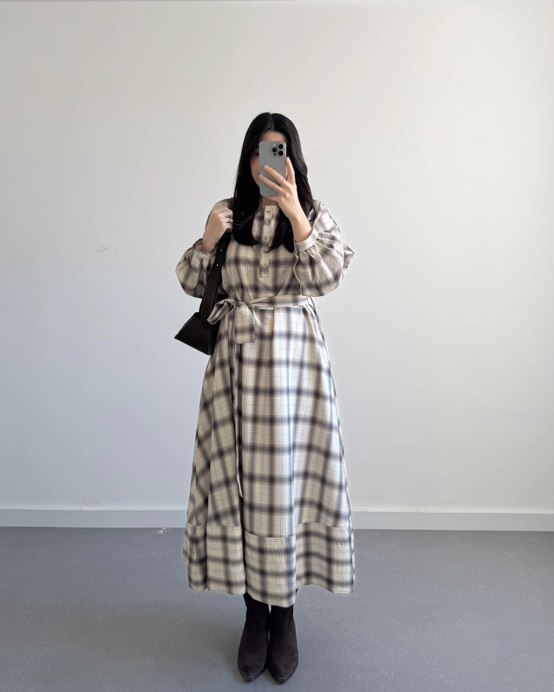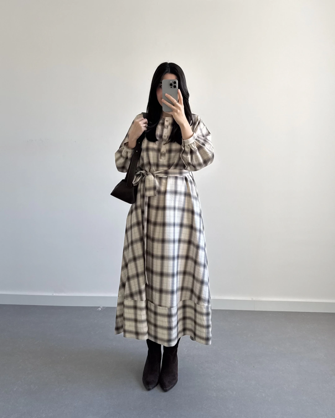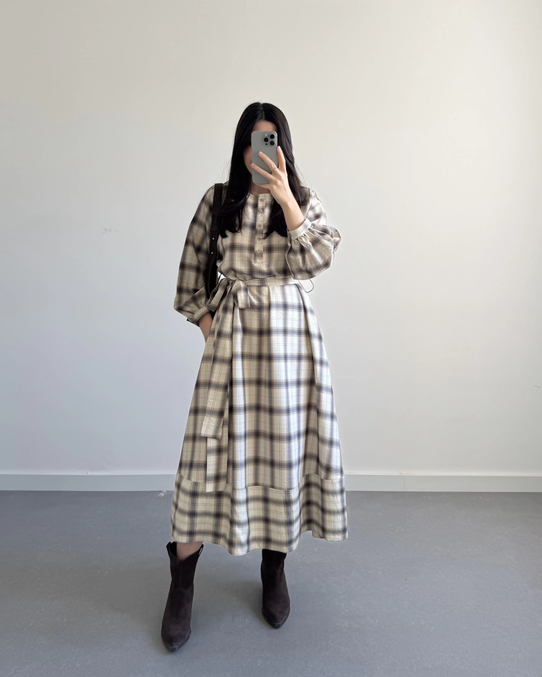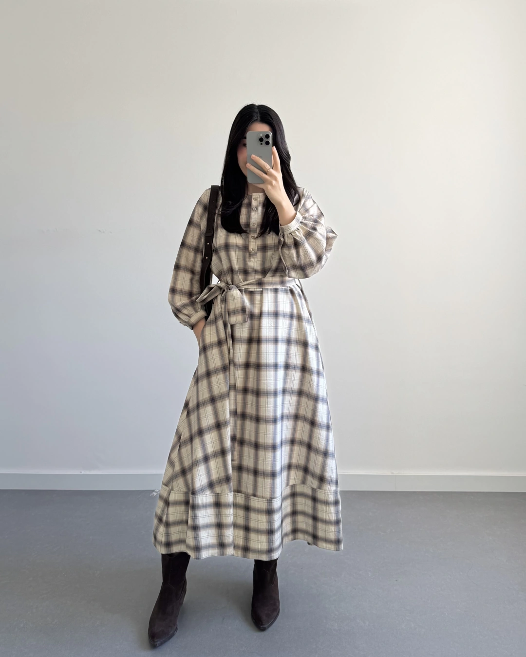 EKOSE DESEN KUŞAKLI ELBİSE KAHVE