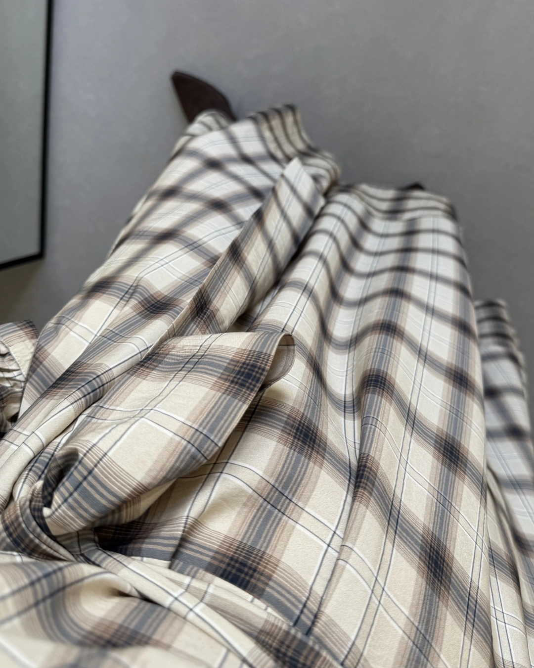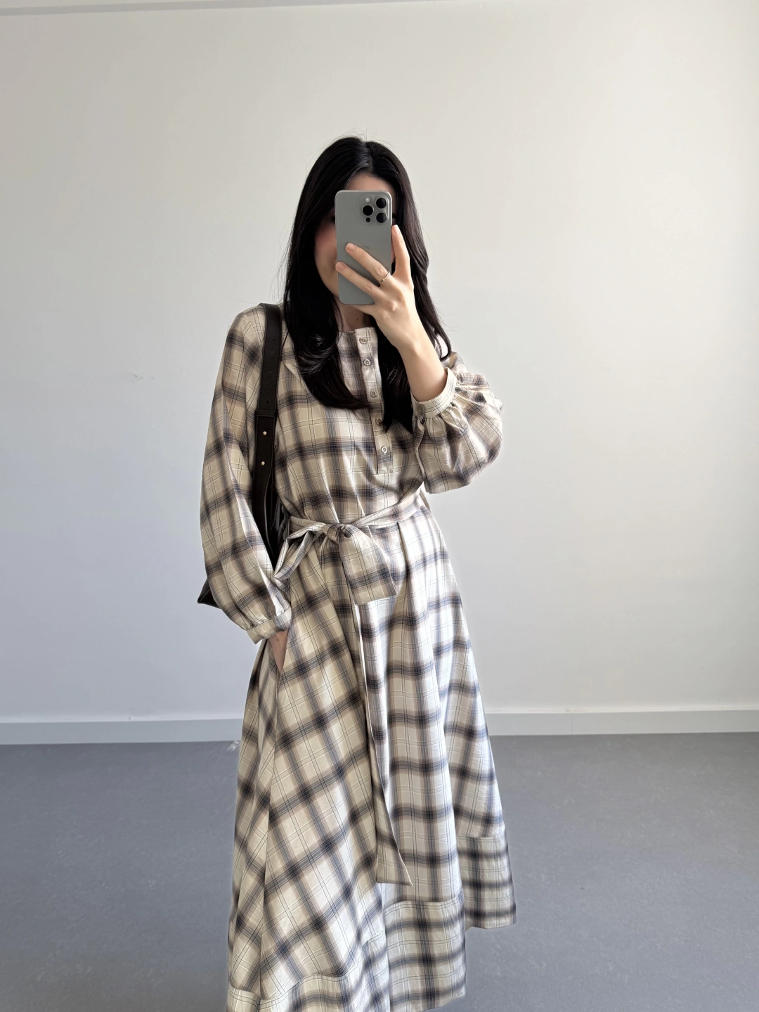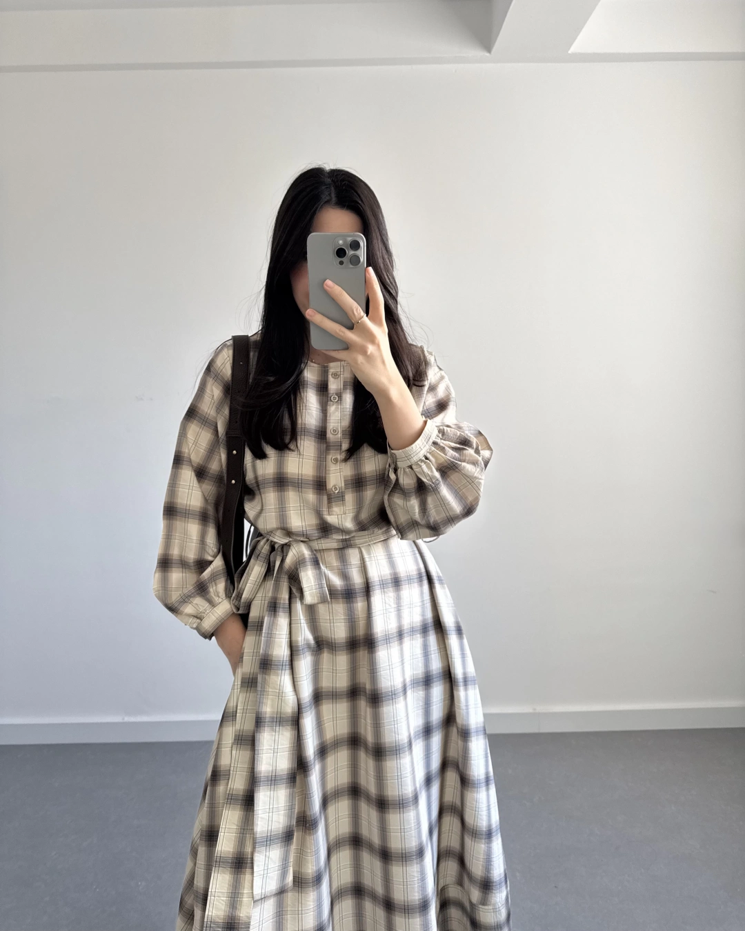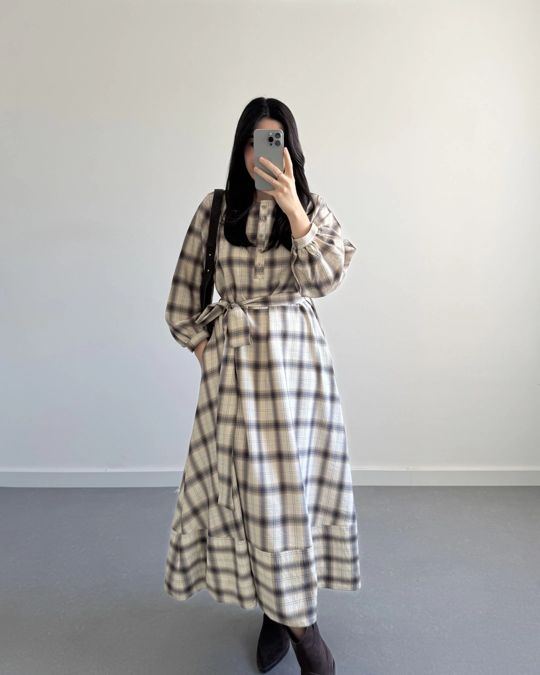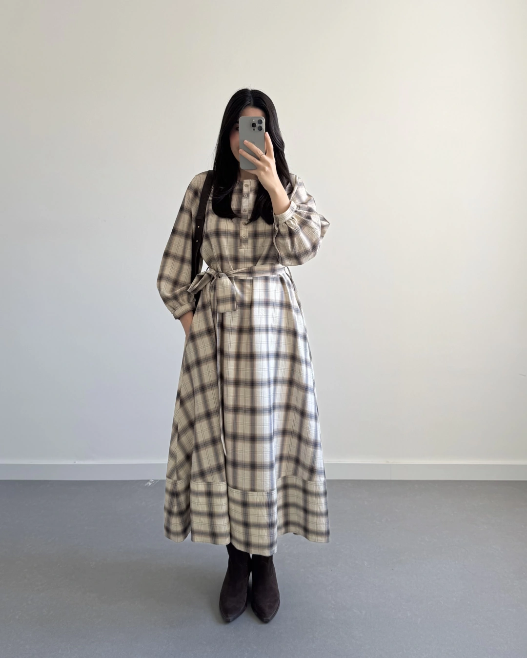 EKOSE DESEN KUŞAKLI ELBİSE KAHVE