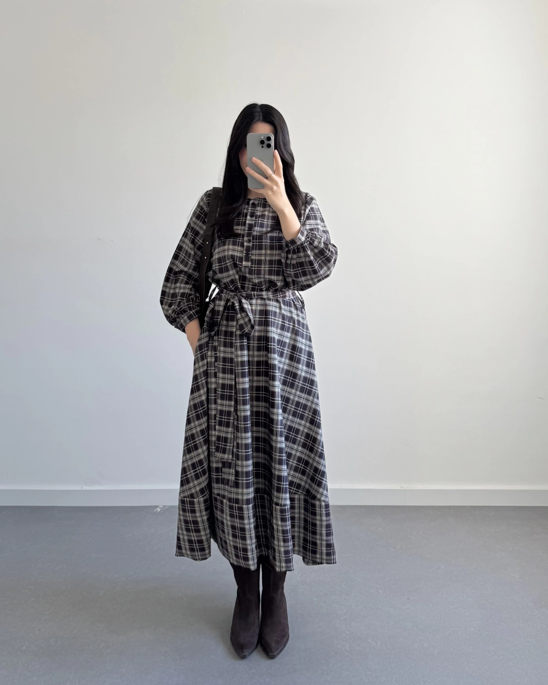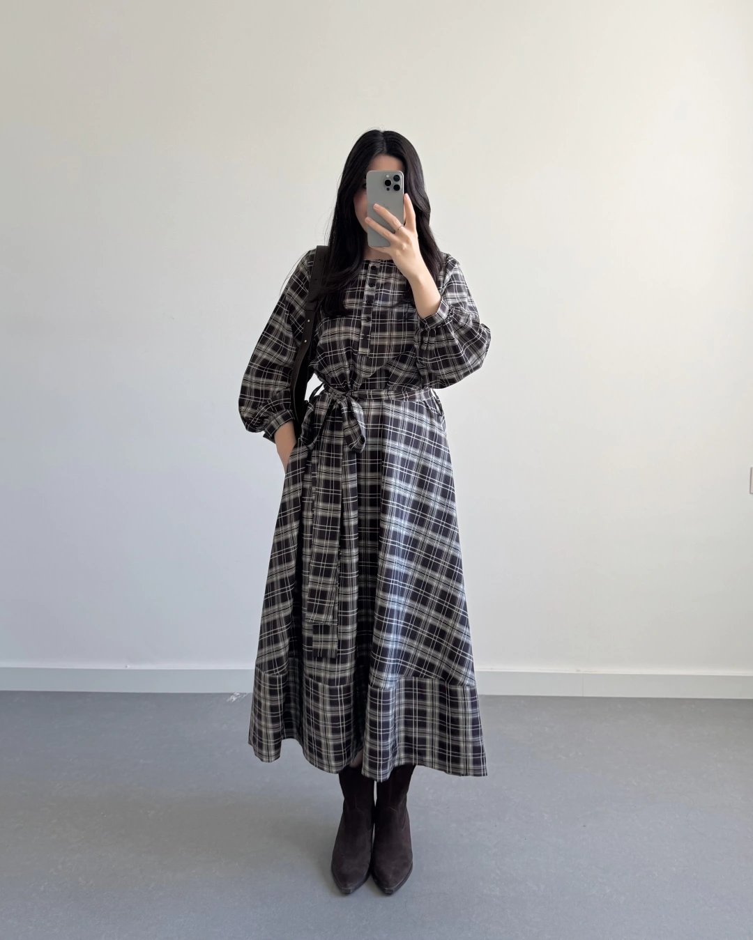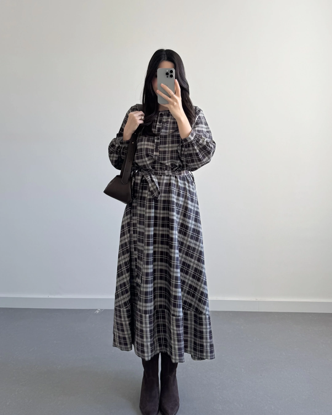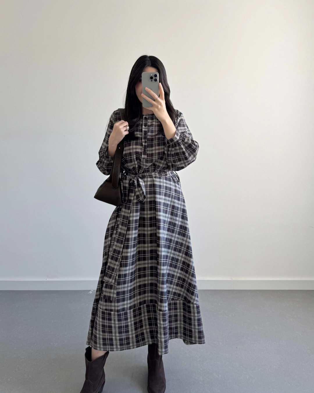 EKOSE DESEN KUŞAKLI ELBİSE KAHVE