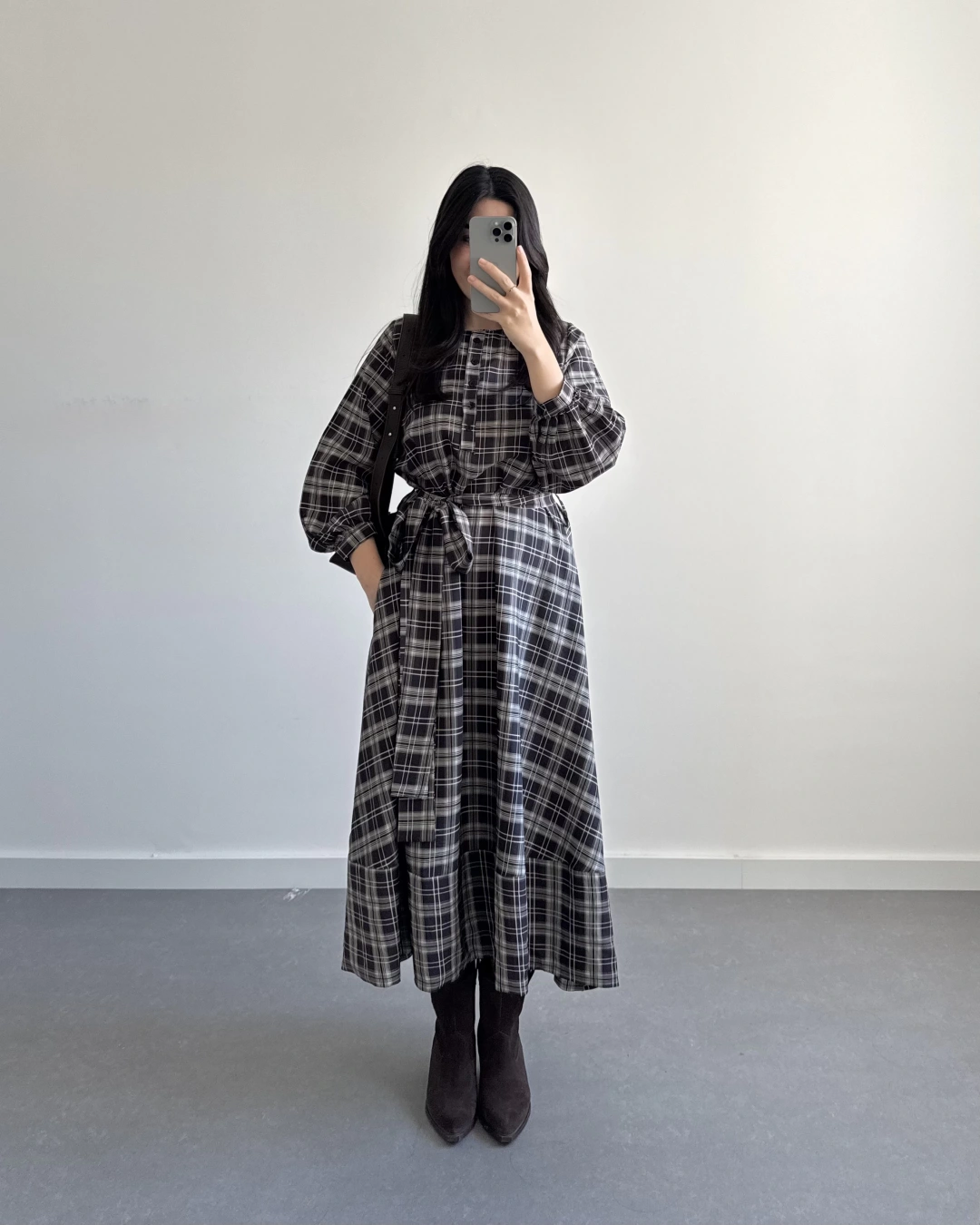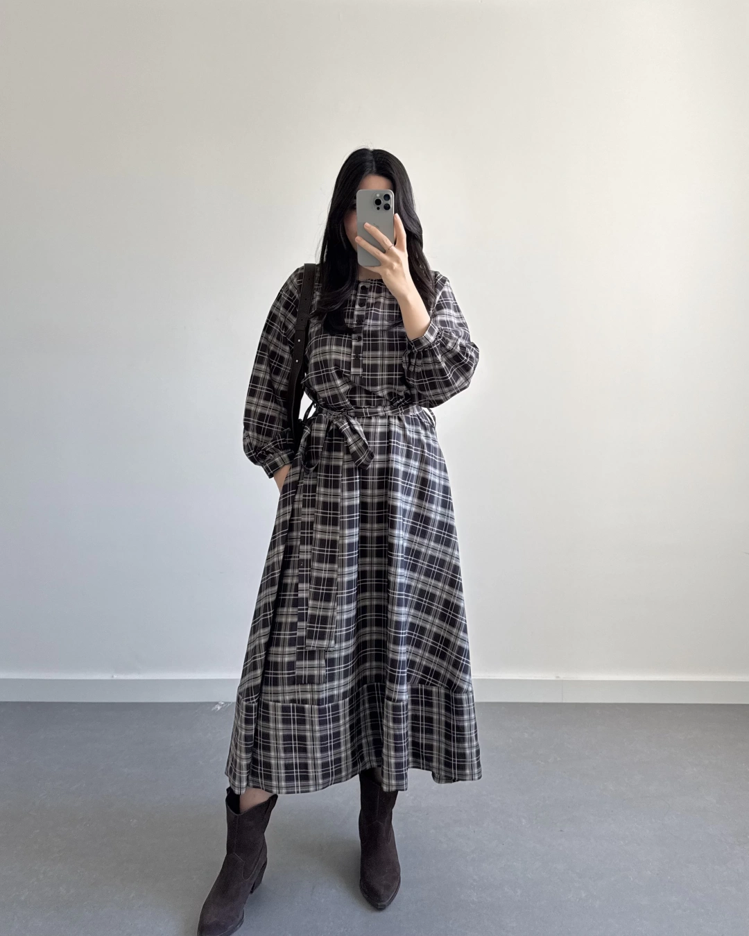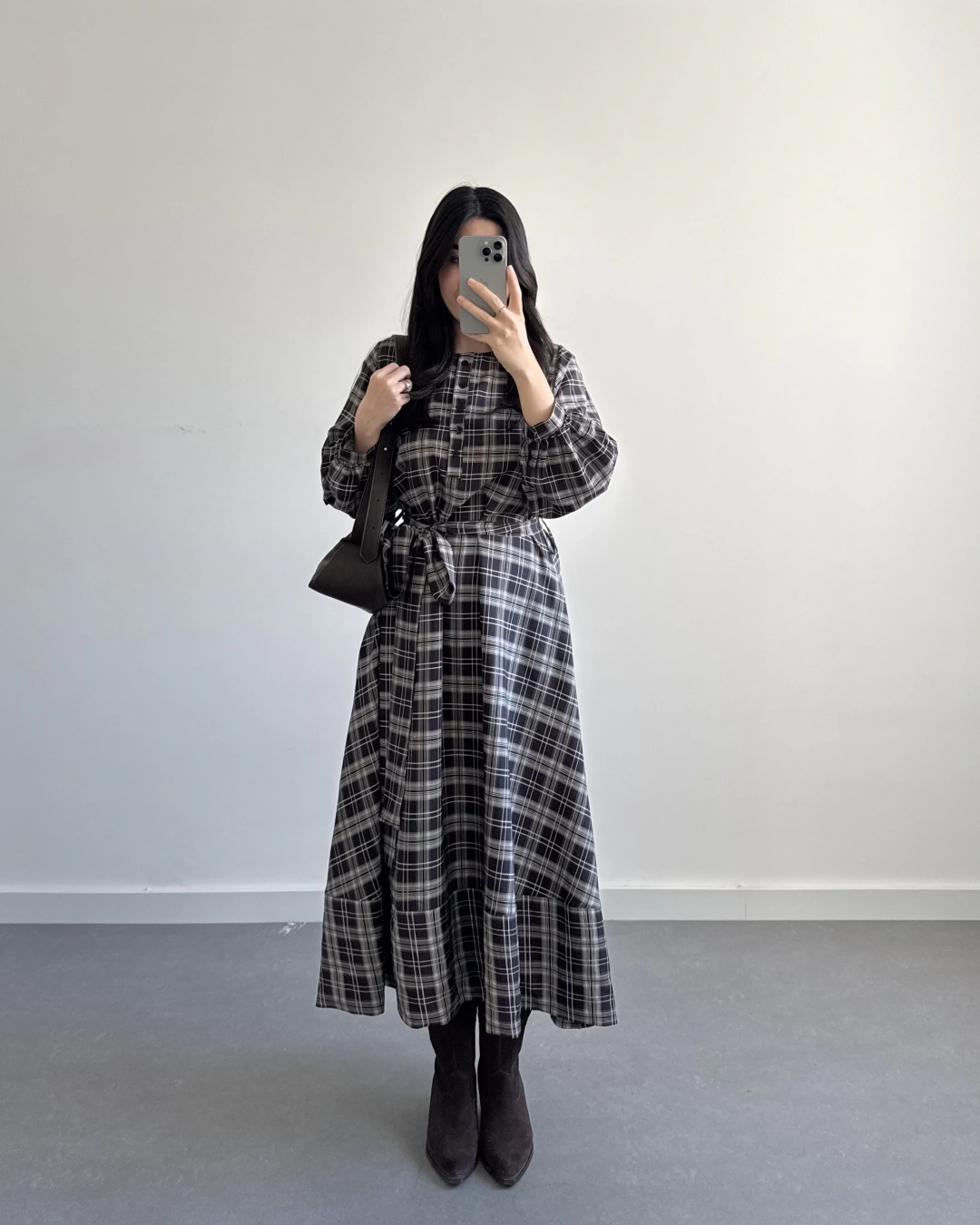 EKOSE DESEN KUŞAKLI ELBİSE KAHVE