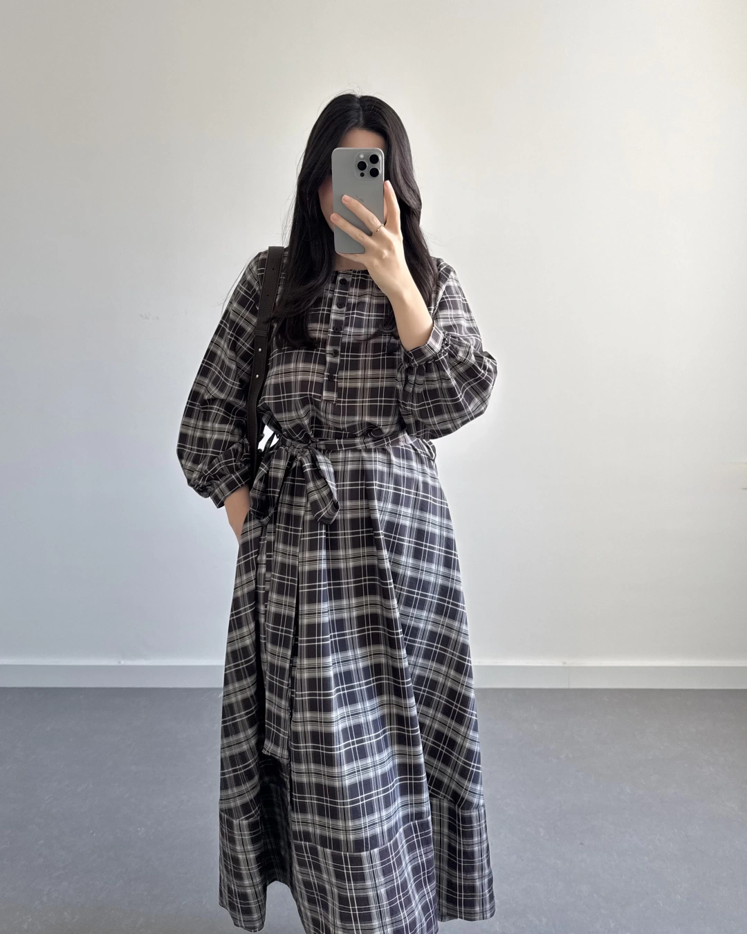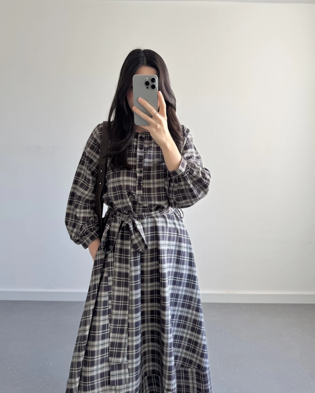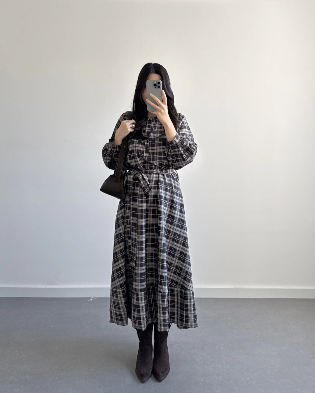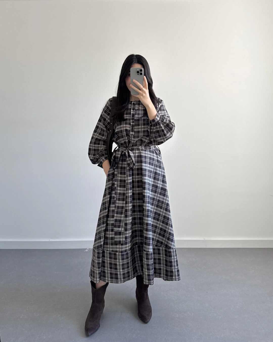 EKOSE DESEN KUŞAKLI ELBİSE KAHVE