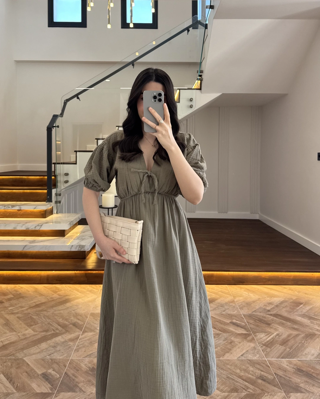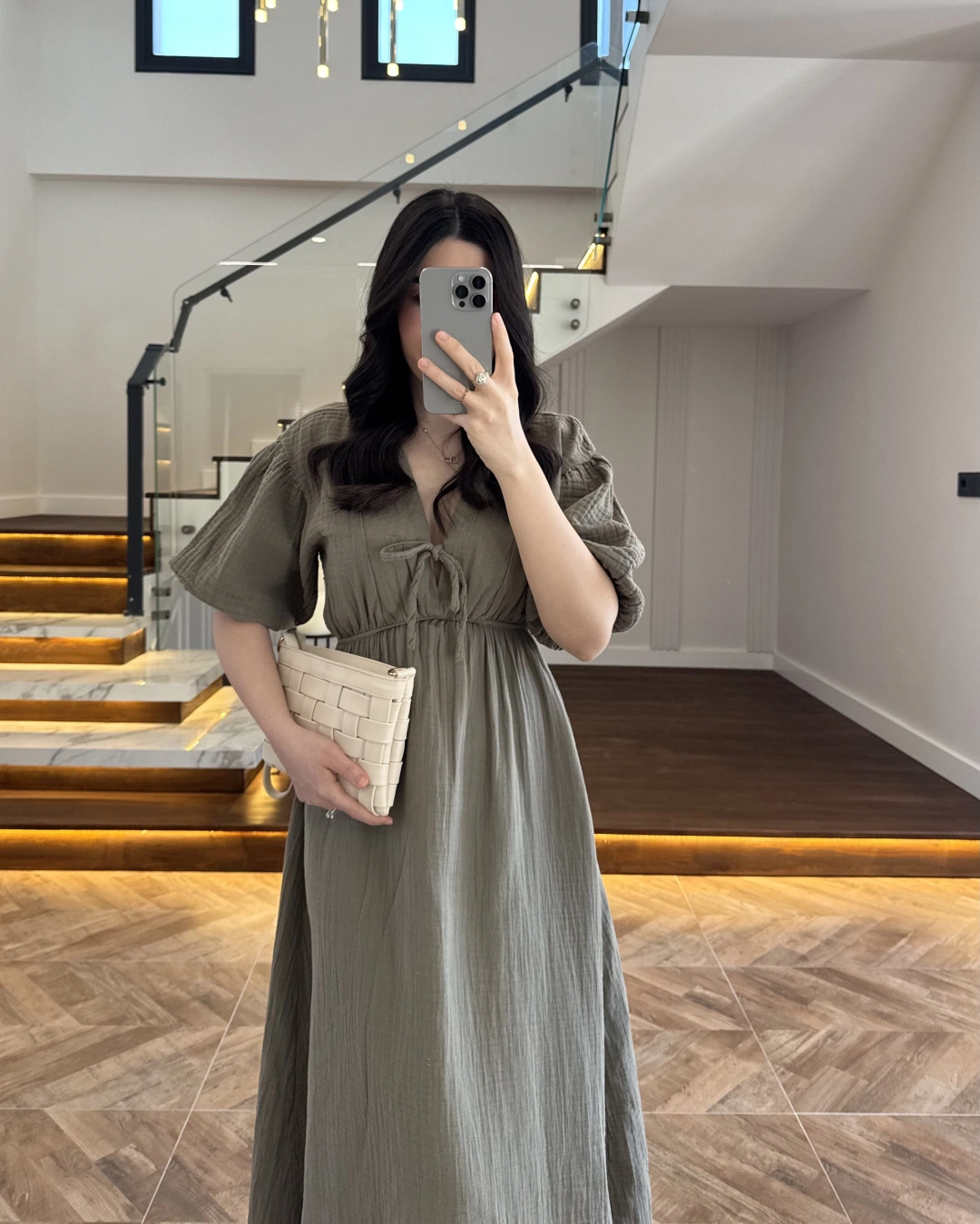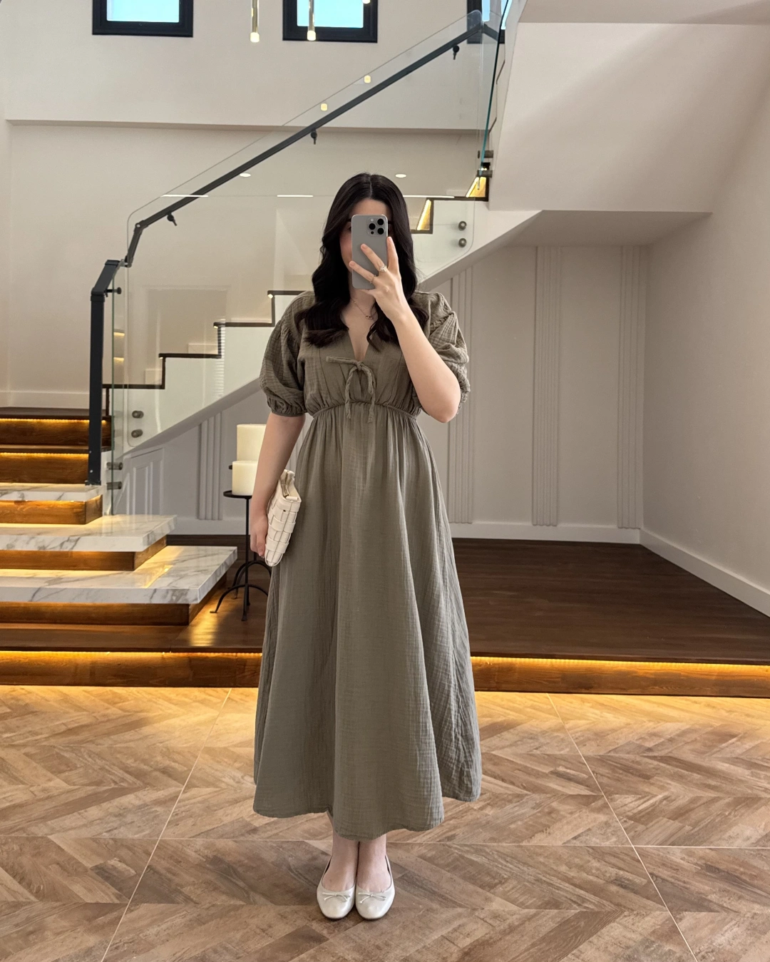 PUANTİYELİ BÜZGÜLÜ BAĞLAMALI ELBİSE - 5092