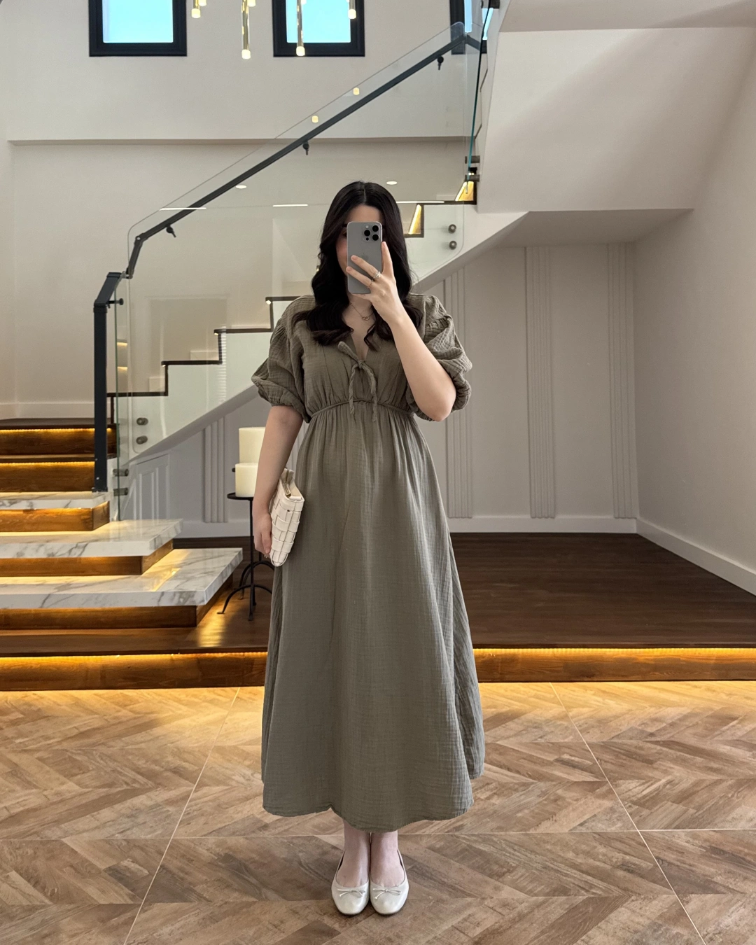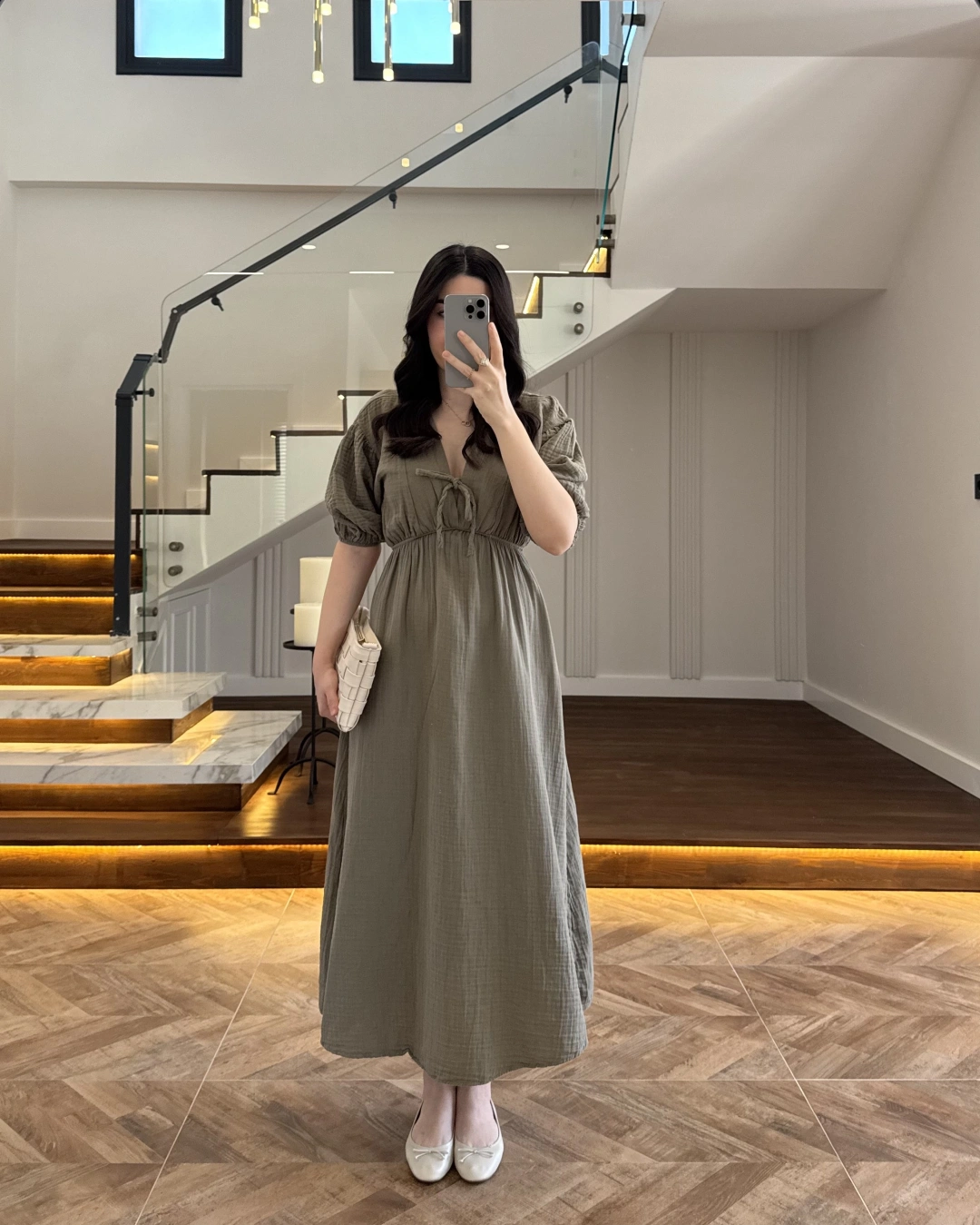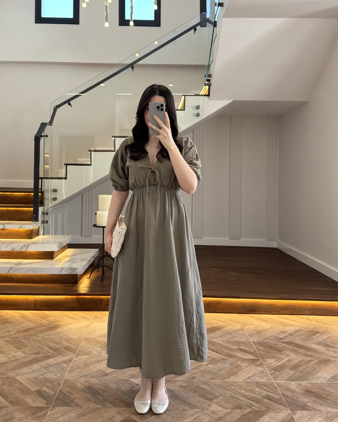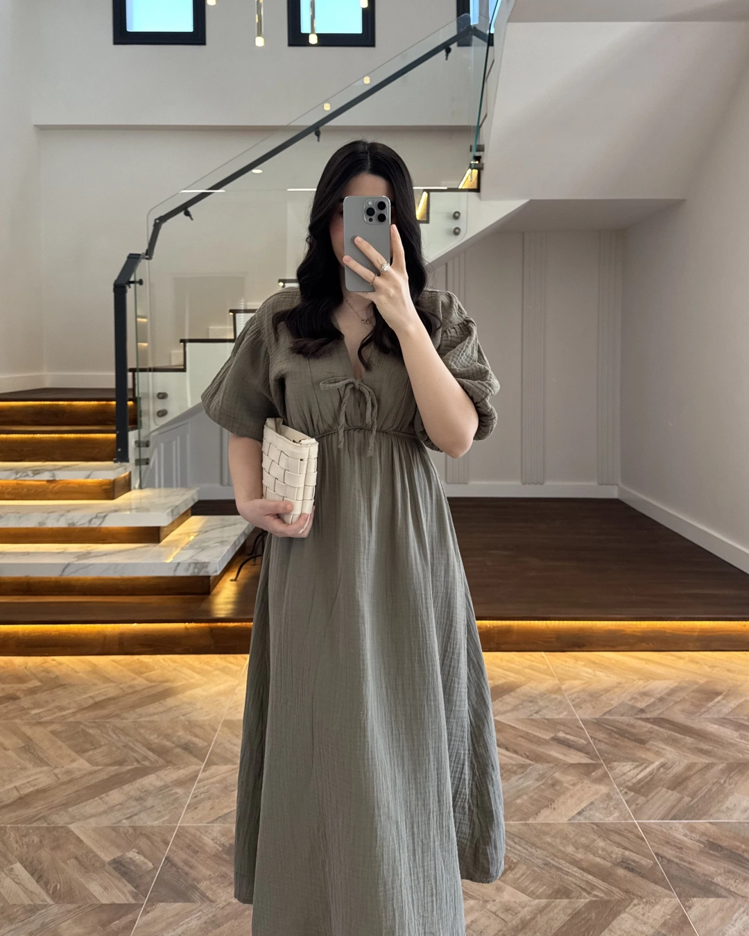 PUANTİYELİ BÜZGÜLÜ BAĞLAMALI ELBİSE - 5092