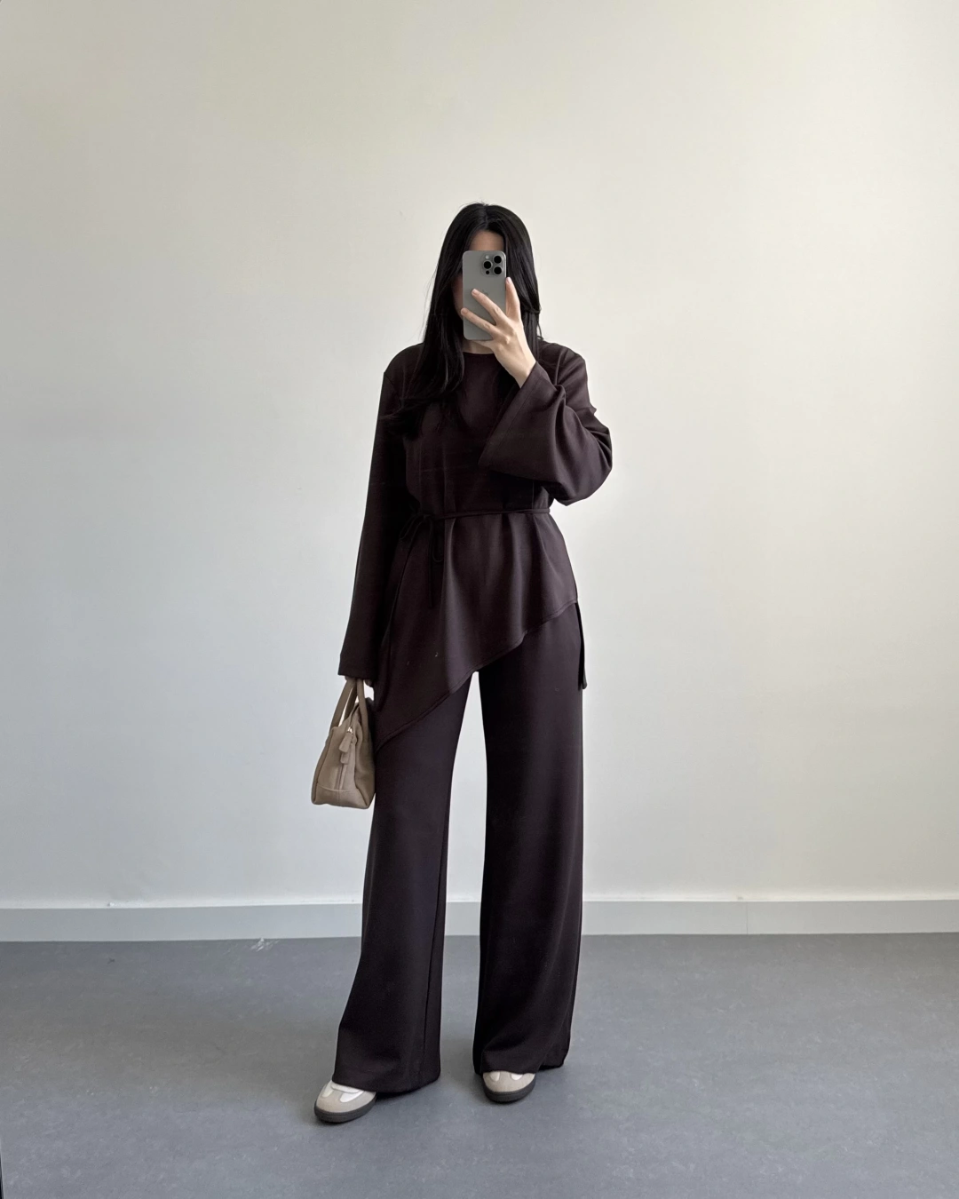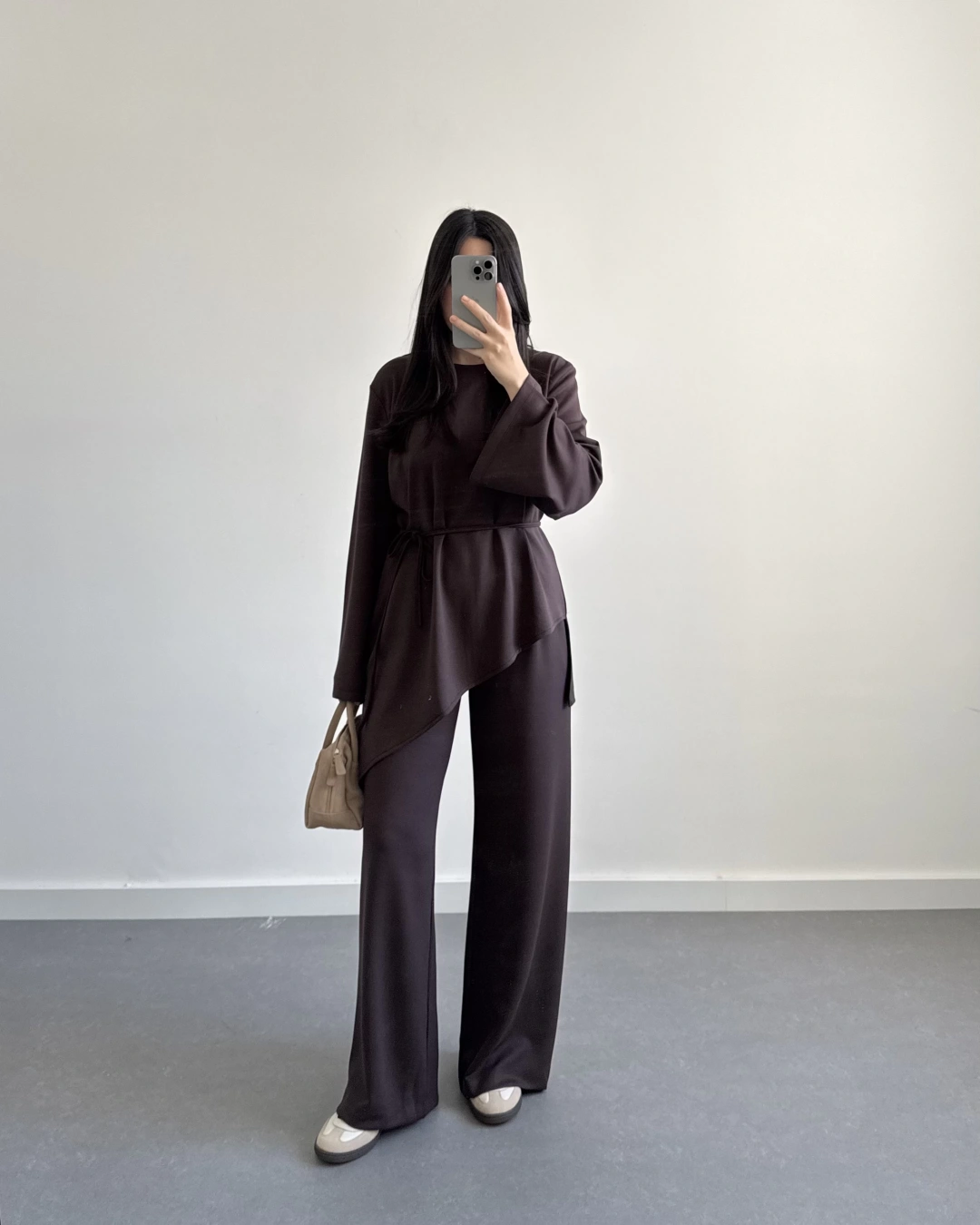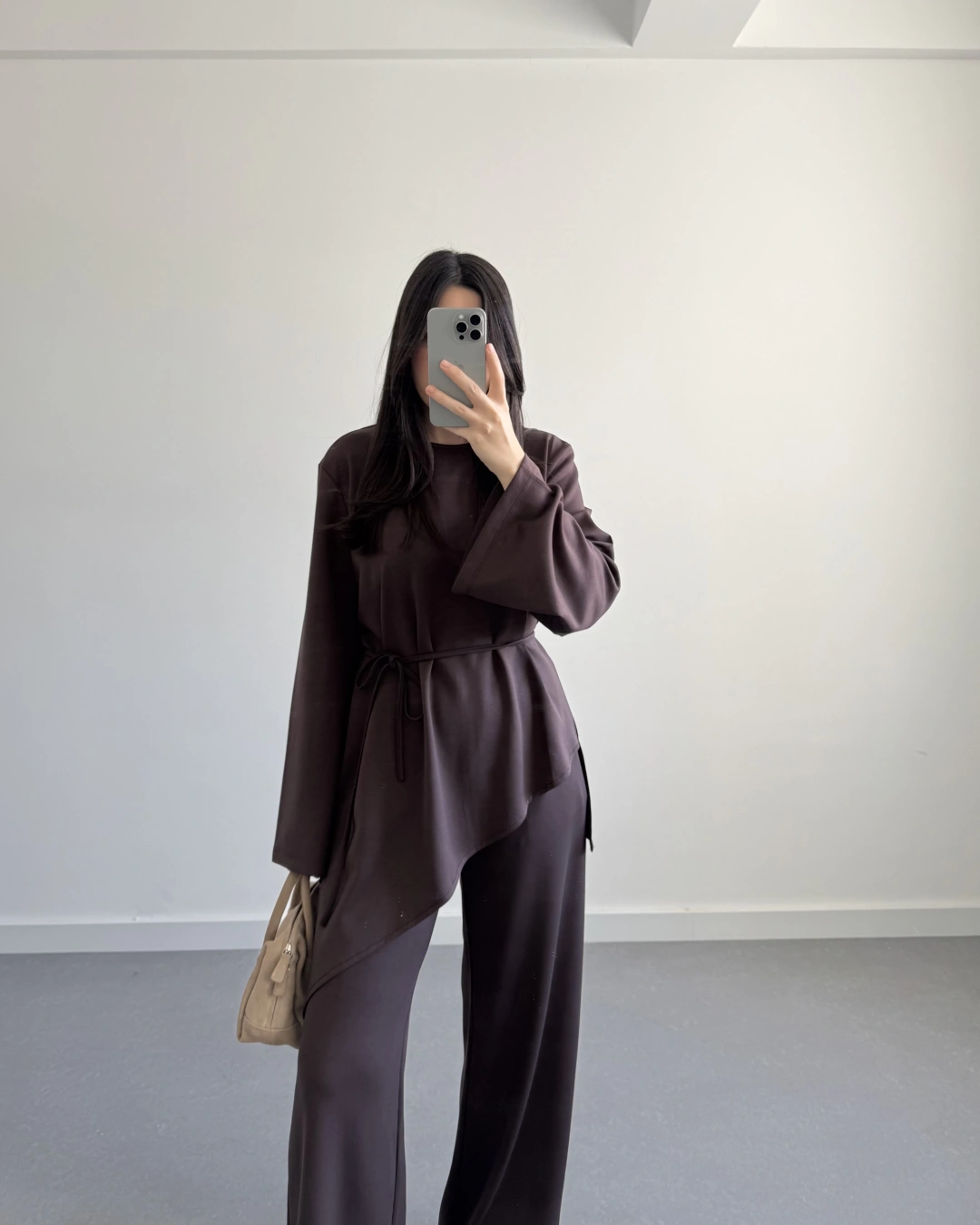 KAHVE ASİMETRİK KESİM UZUN KOL TAKIM