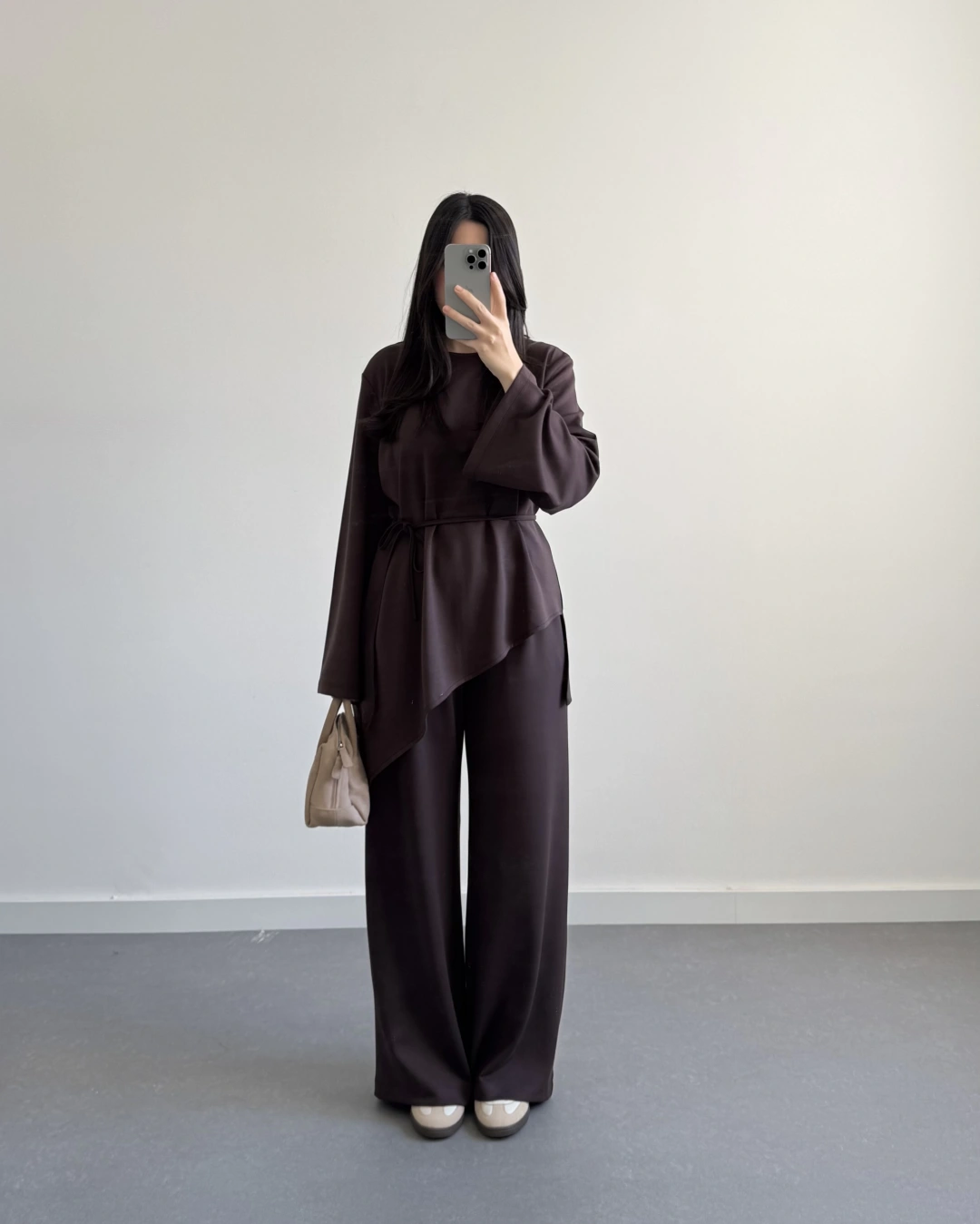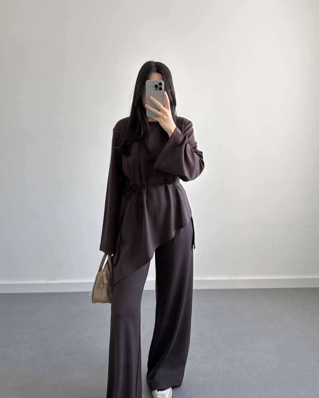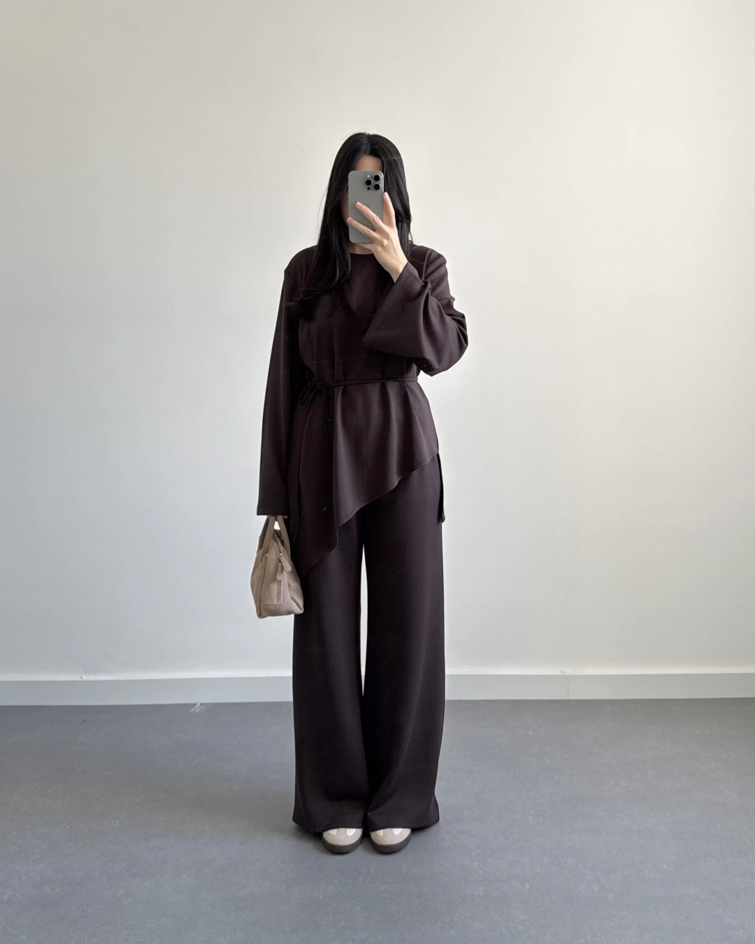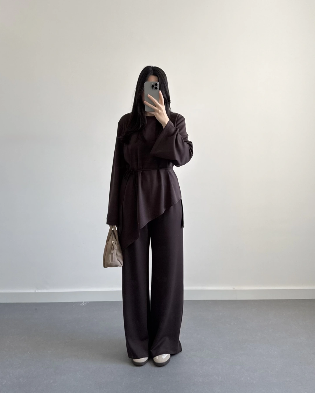 KAHVE ASİMETRİK KESİM UZUN KOL TAKIM