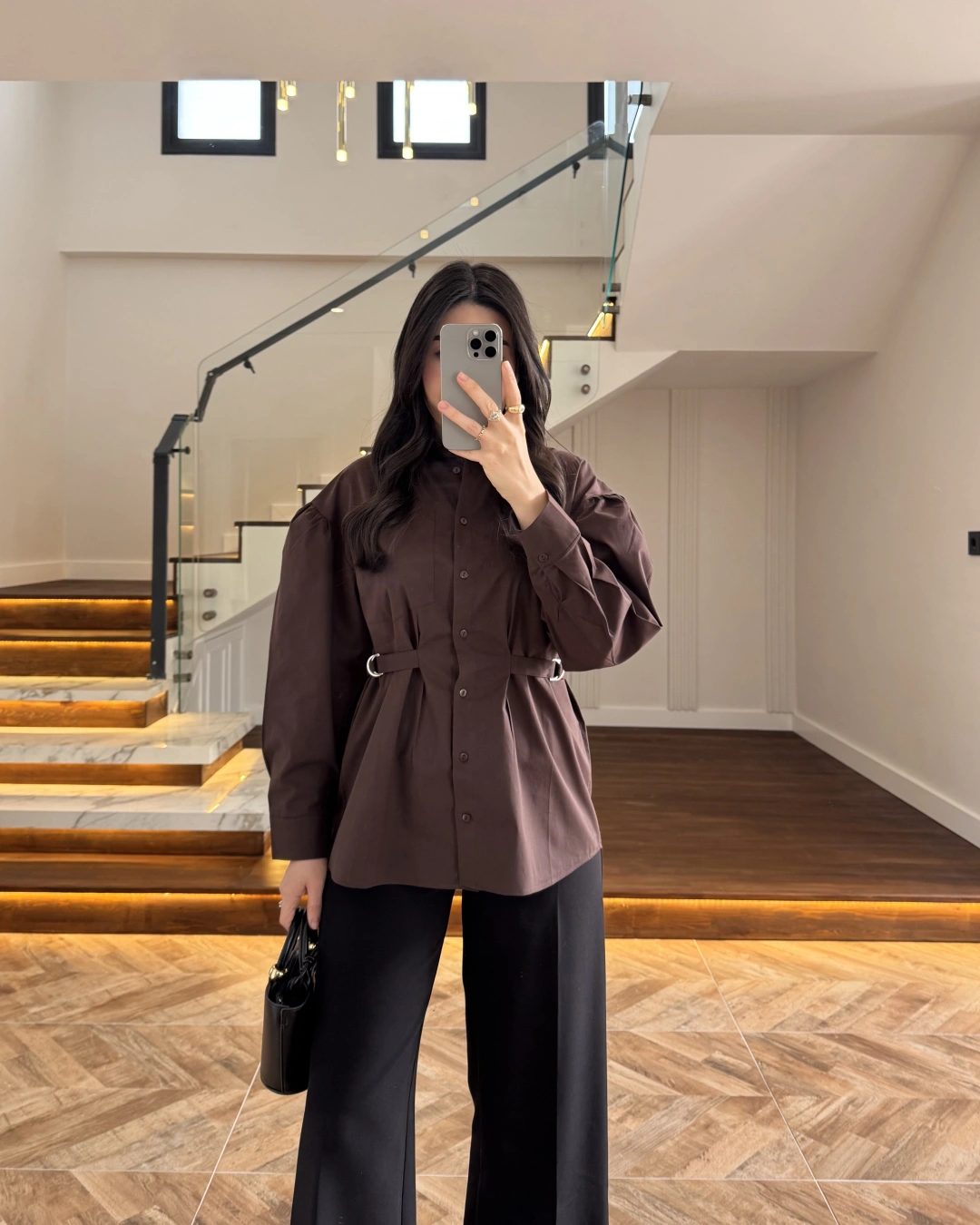 KAHVE BAĞLAMA DETAY POPLİN GÖMLEK -5441