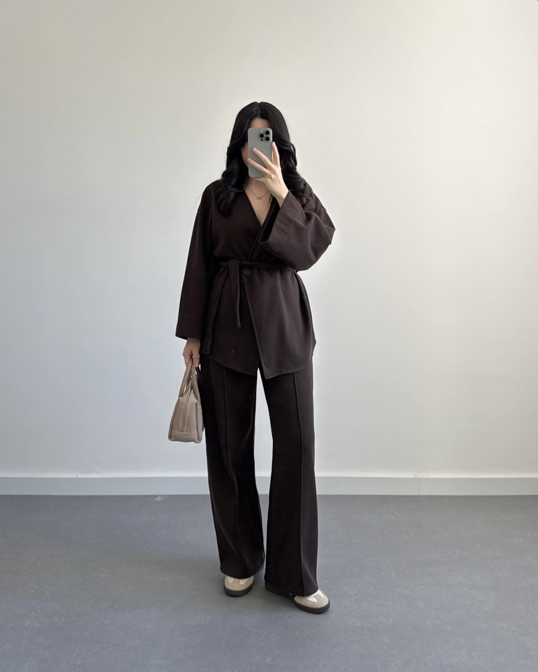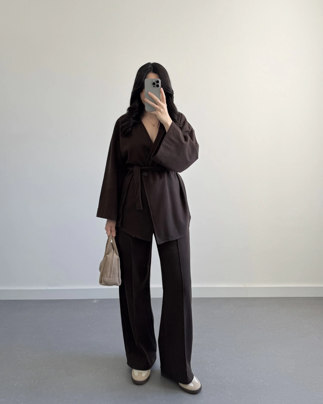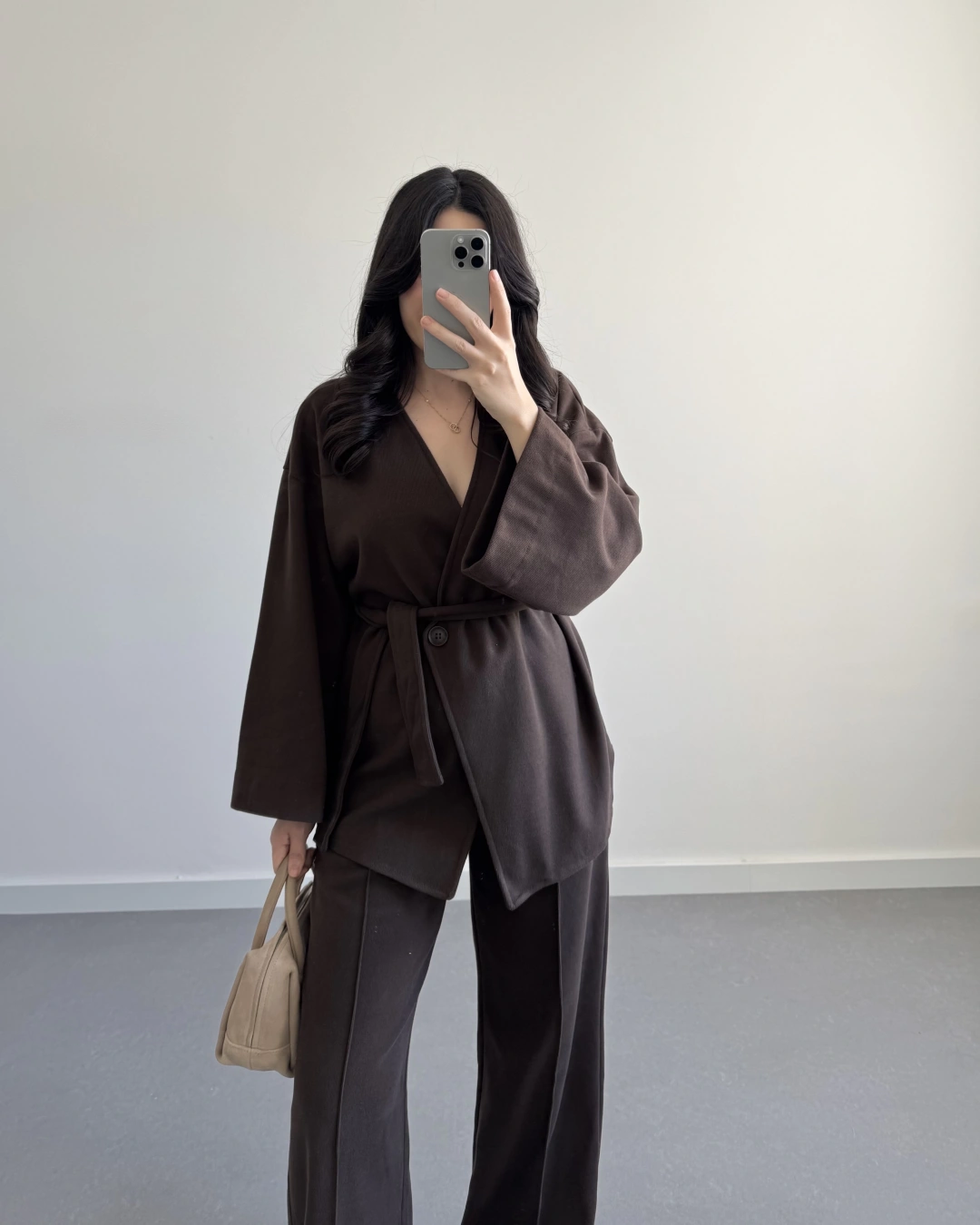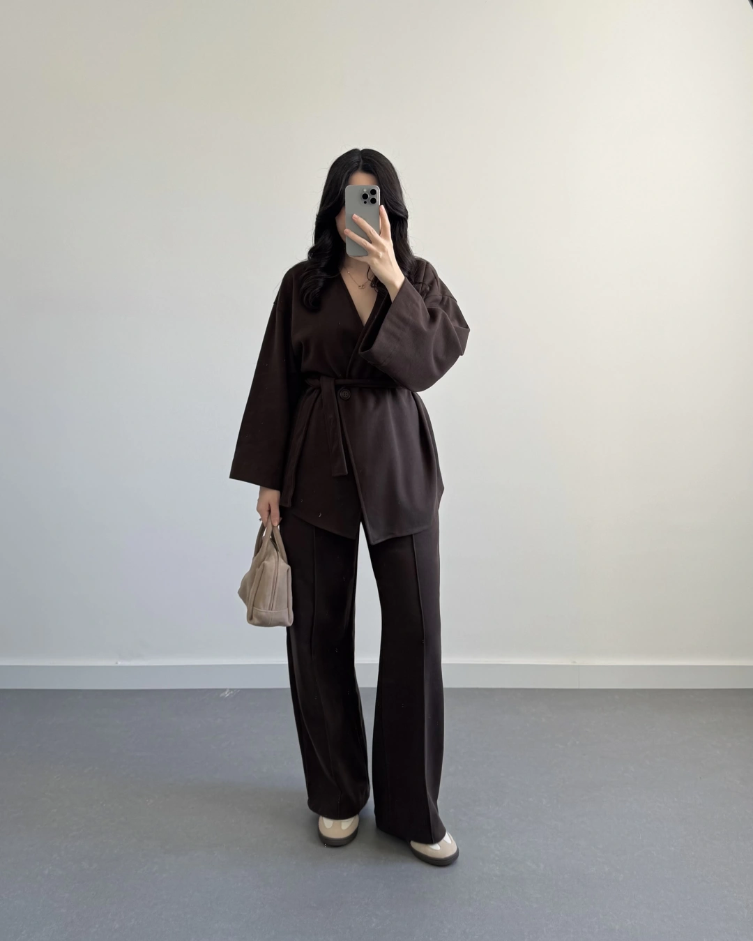 KAHVE KRUVAZE YAKA BELİ KUŞAKLI TAKIM