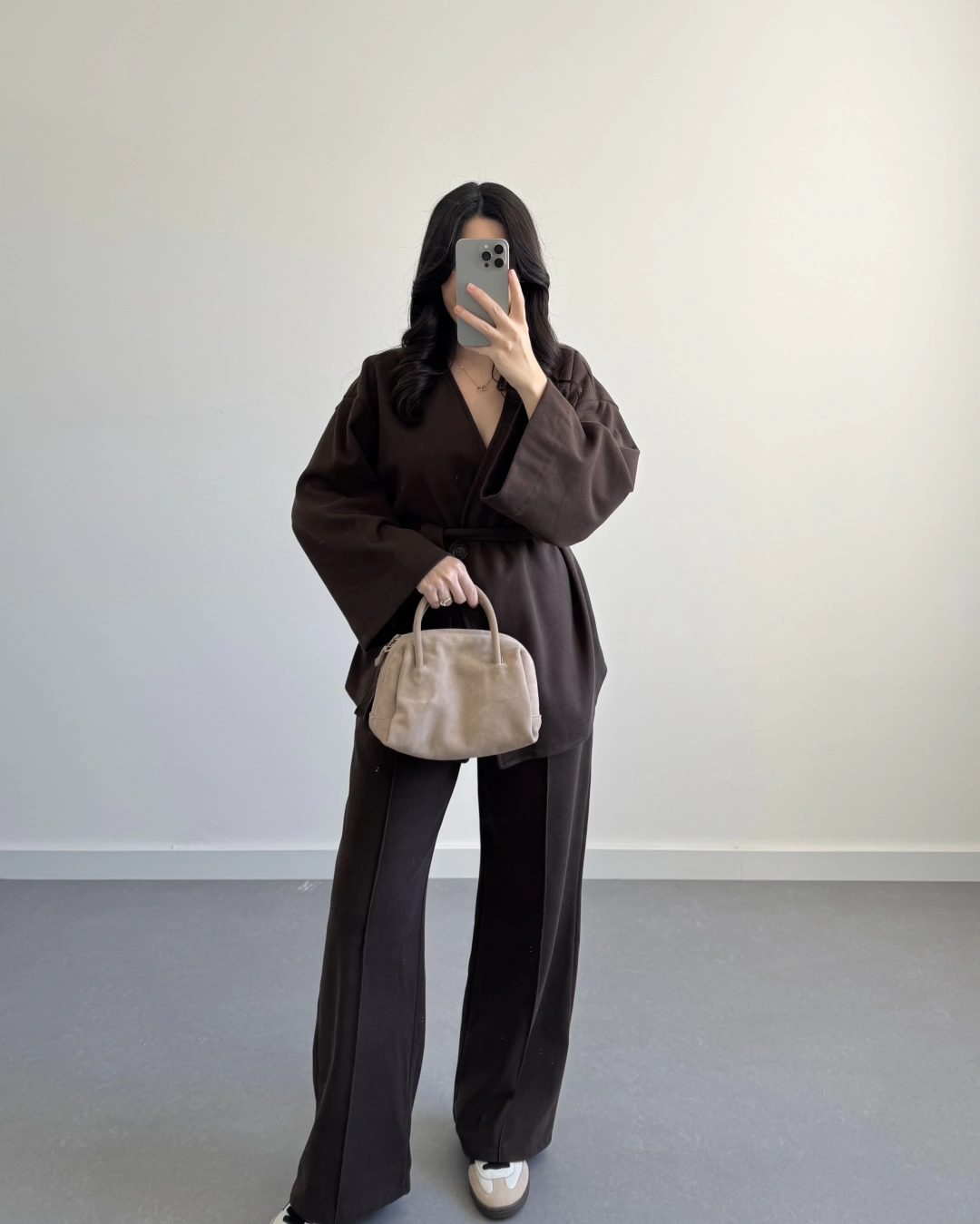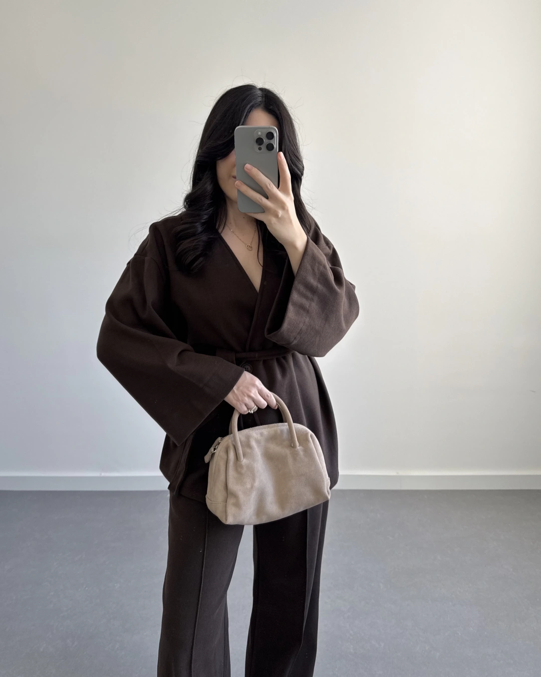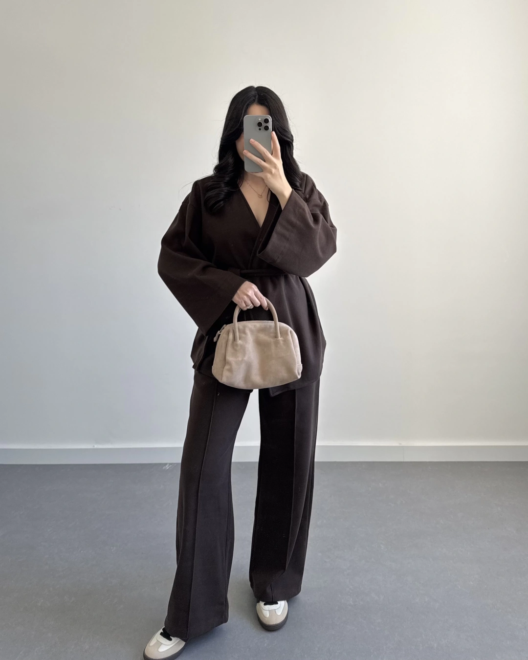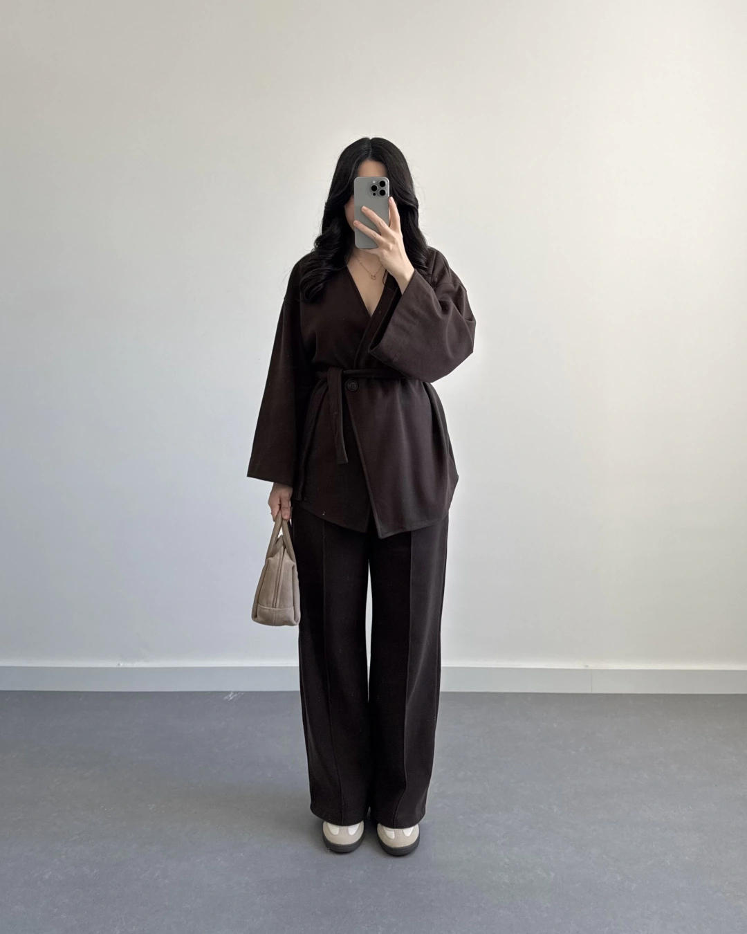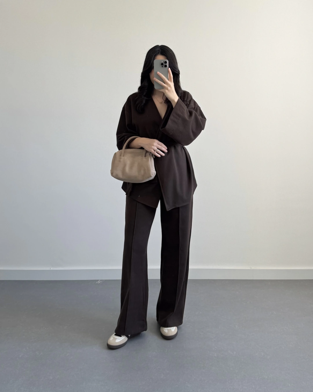 KAHVE KRUVAZE YAKA BELİ KUŞAKLI TAKIM