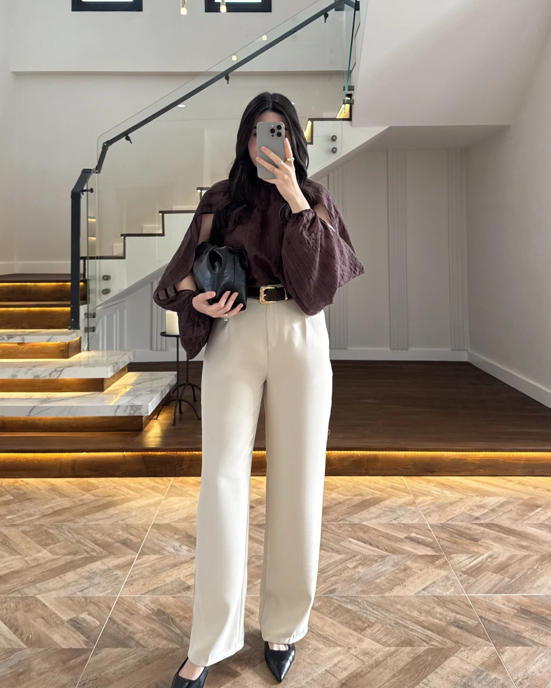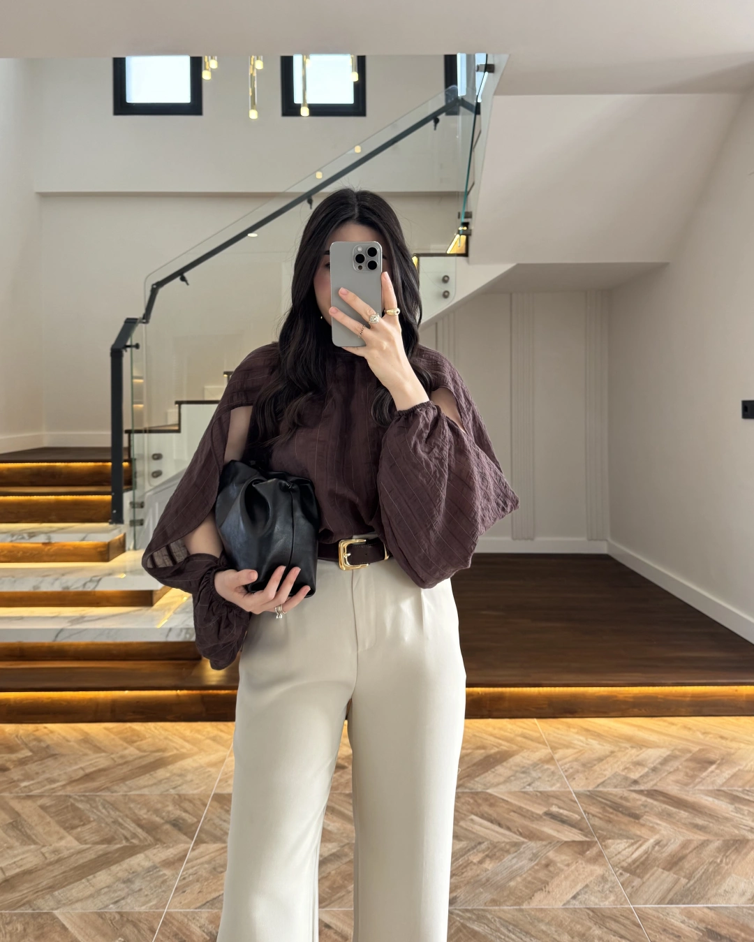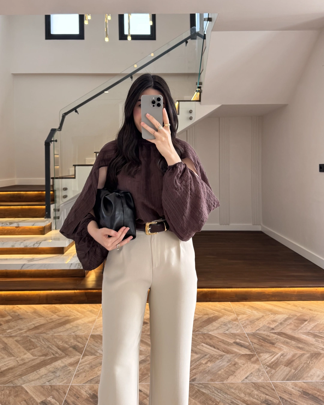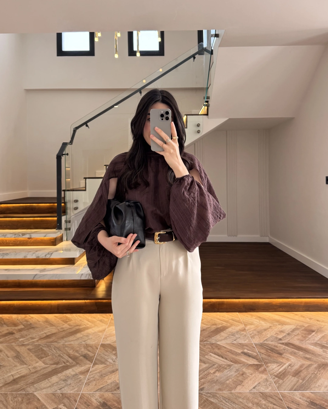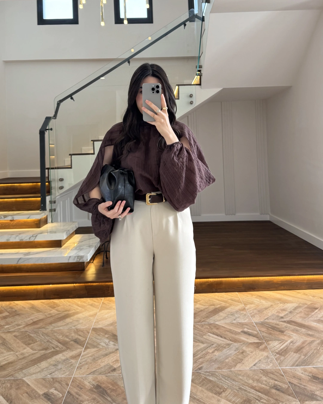 KAHVE TASARIM BALON KOL BLUZ -5415