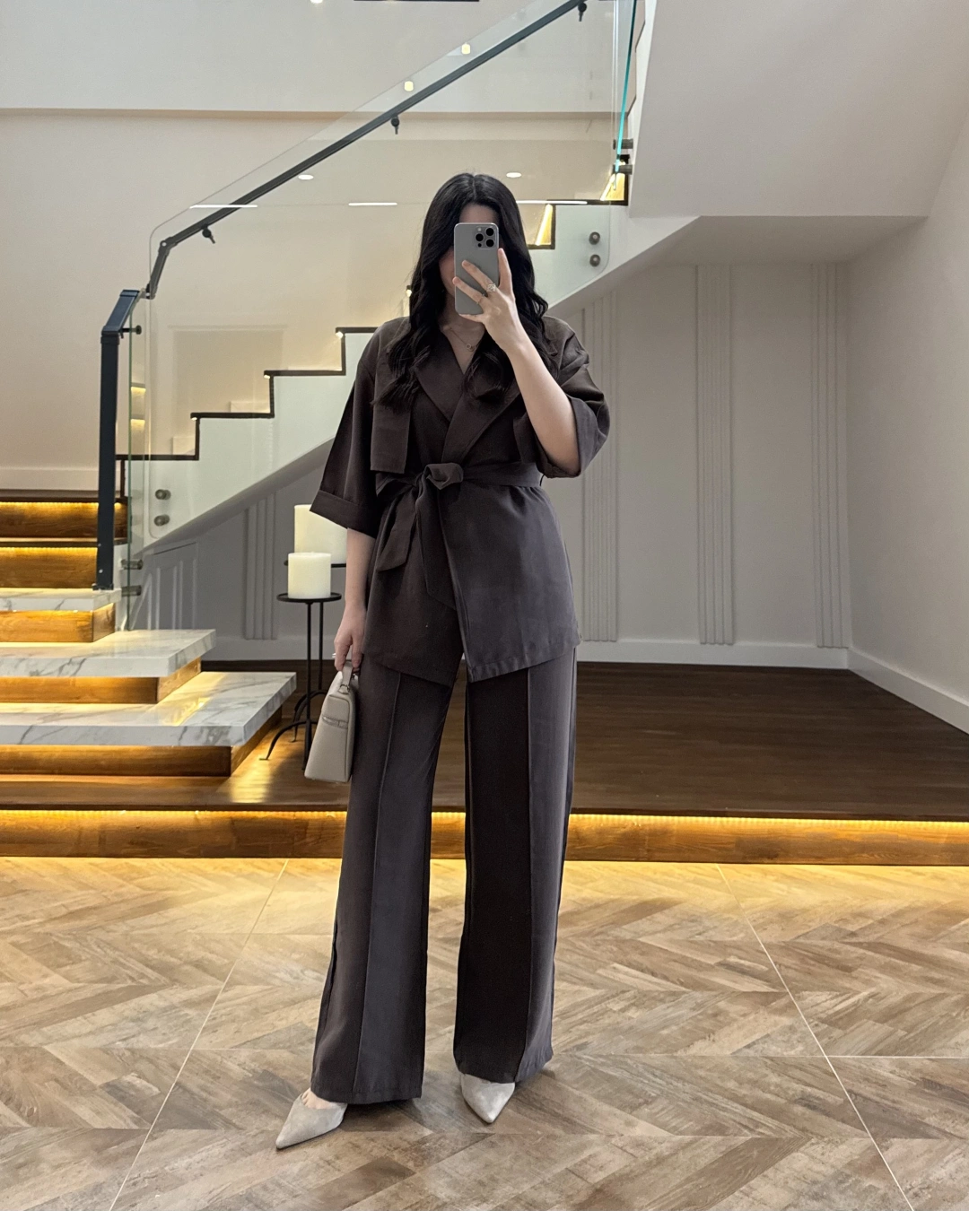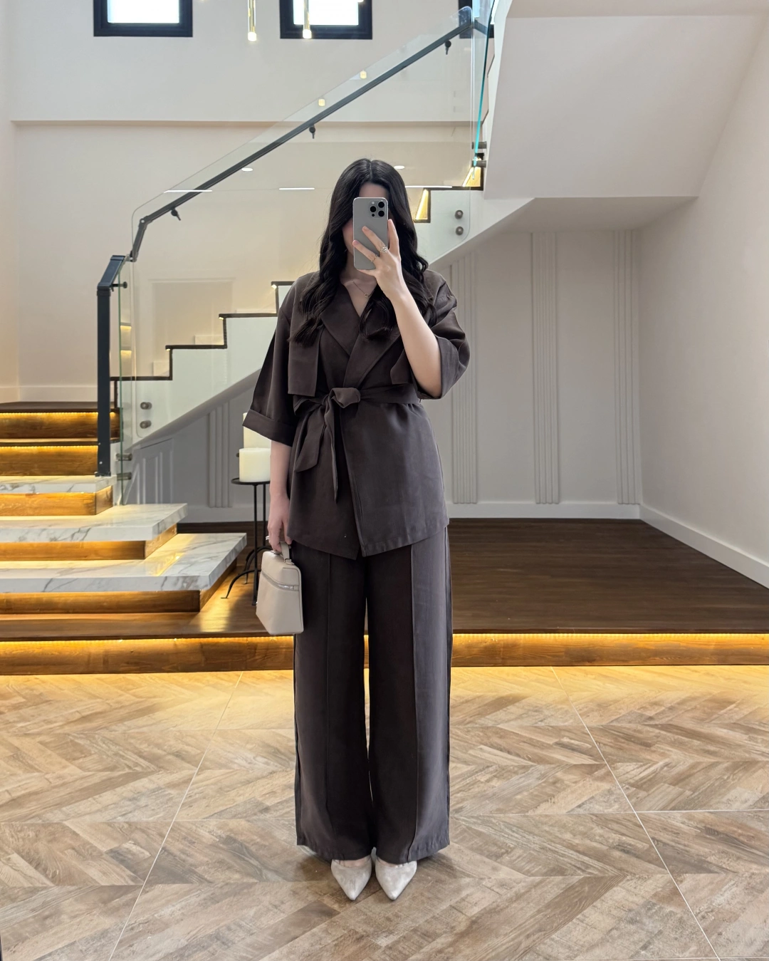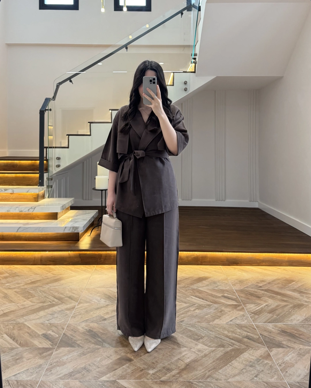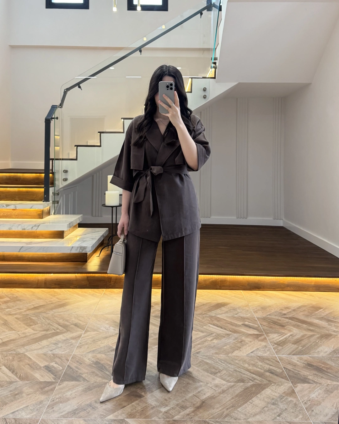 KAHVE TENSEL YARIM KOL GÖMLEK PANTOLON TAKIM -267309