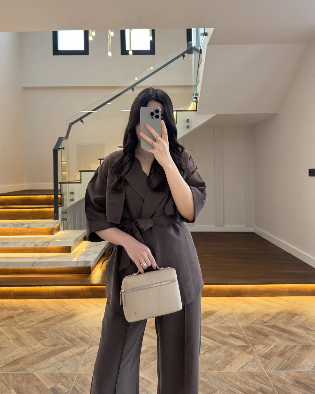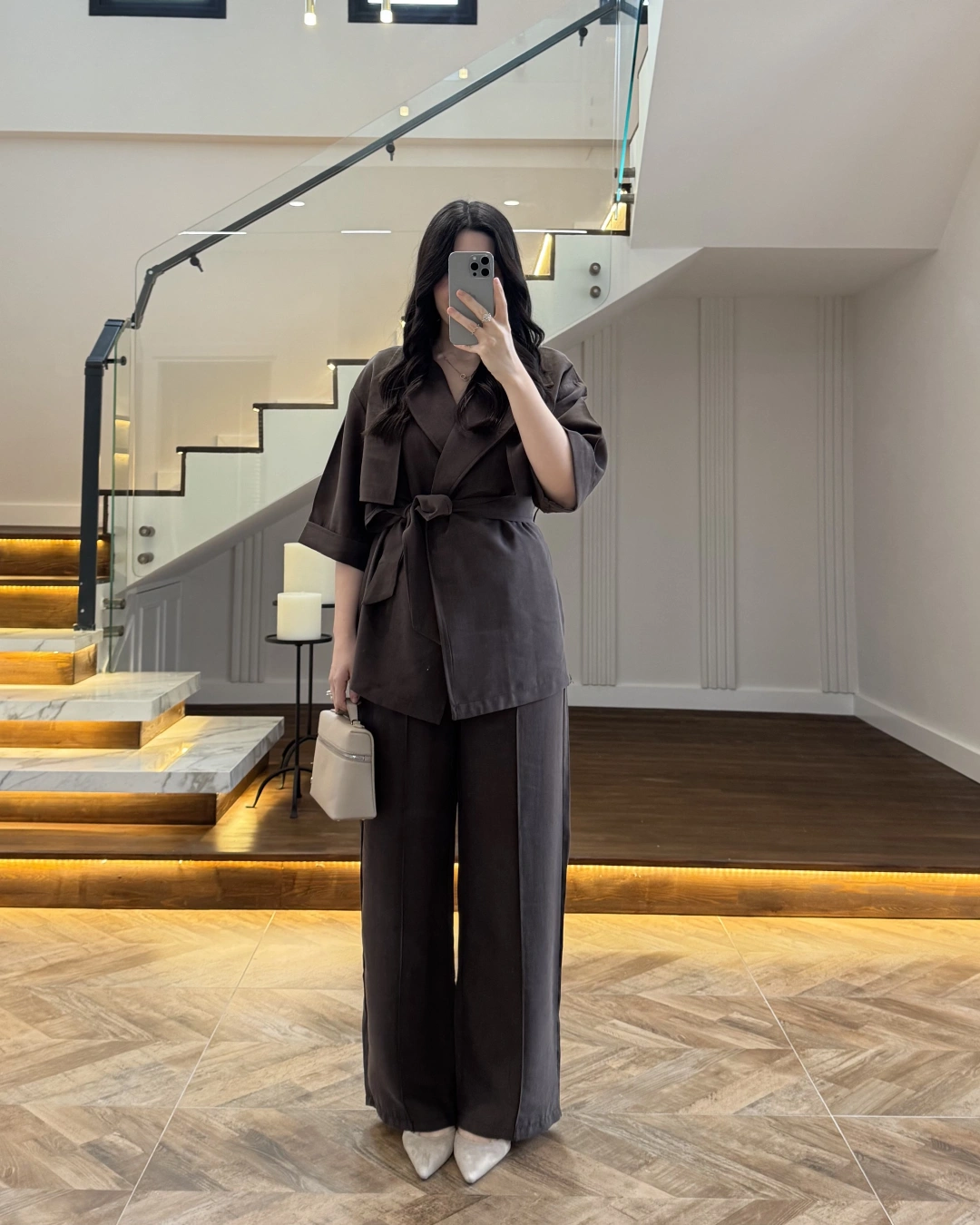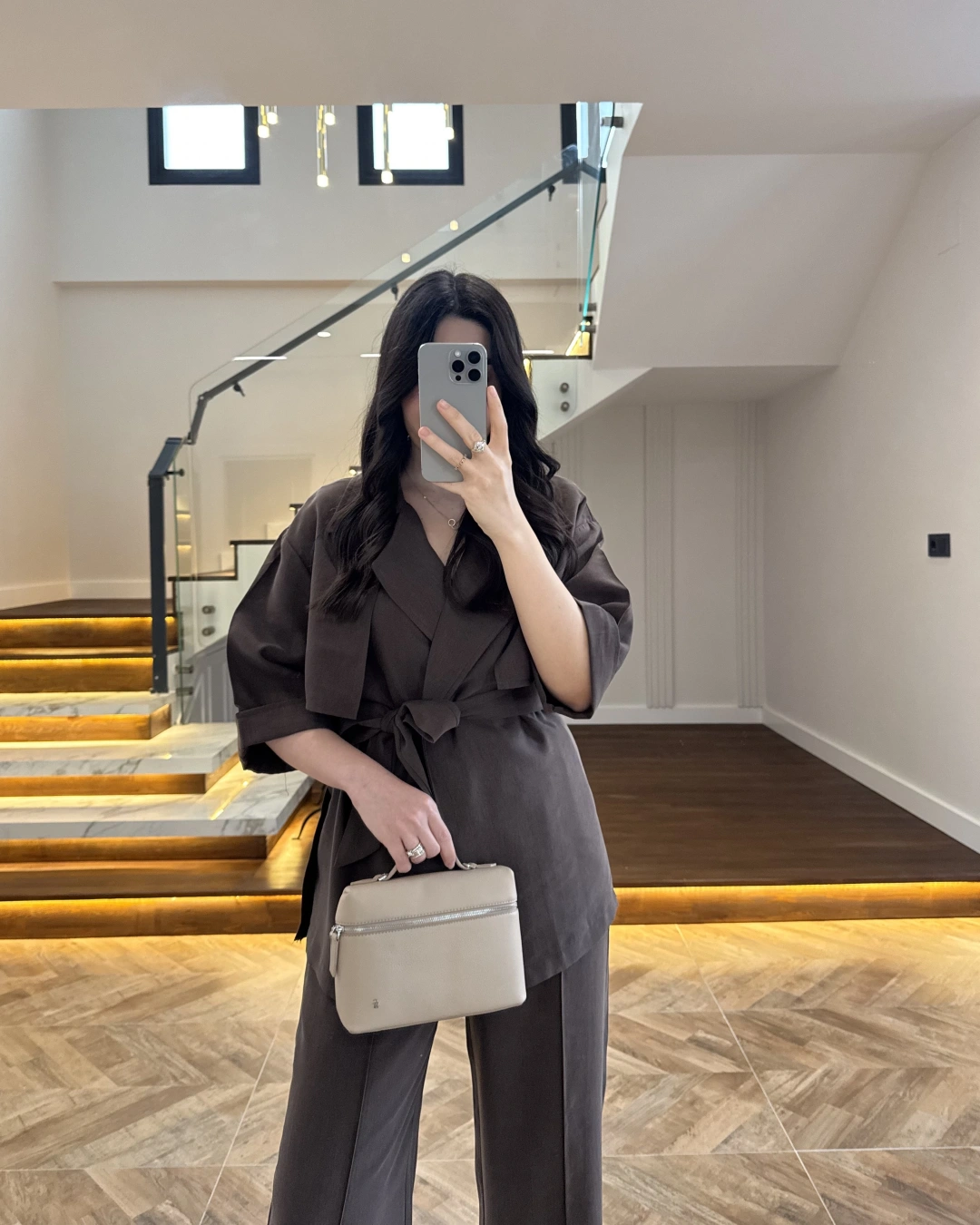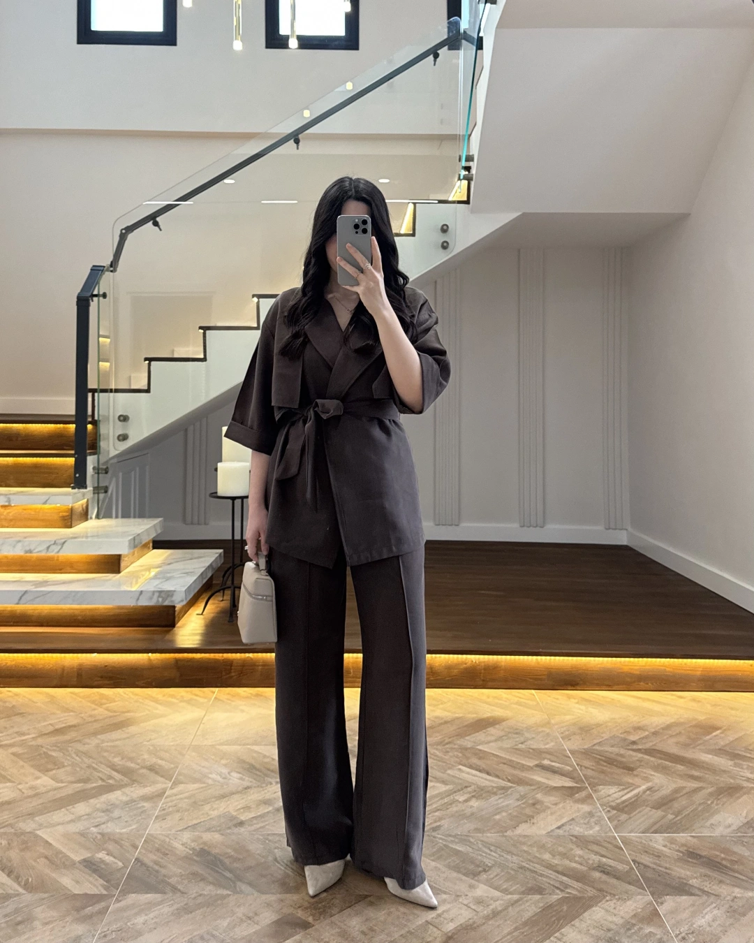KAHVE TENSEL YARIM KOL GÖMLEK PANTOLON TAKIM -267309