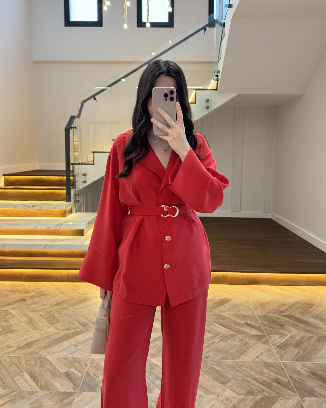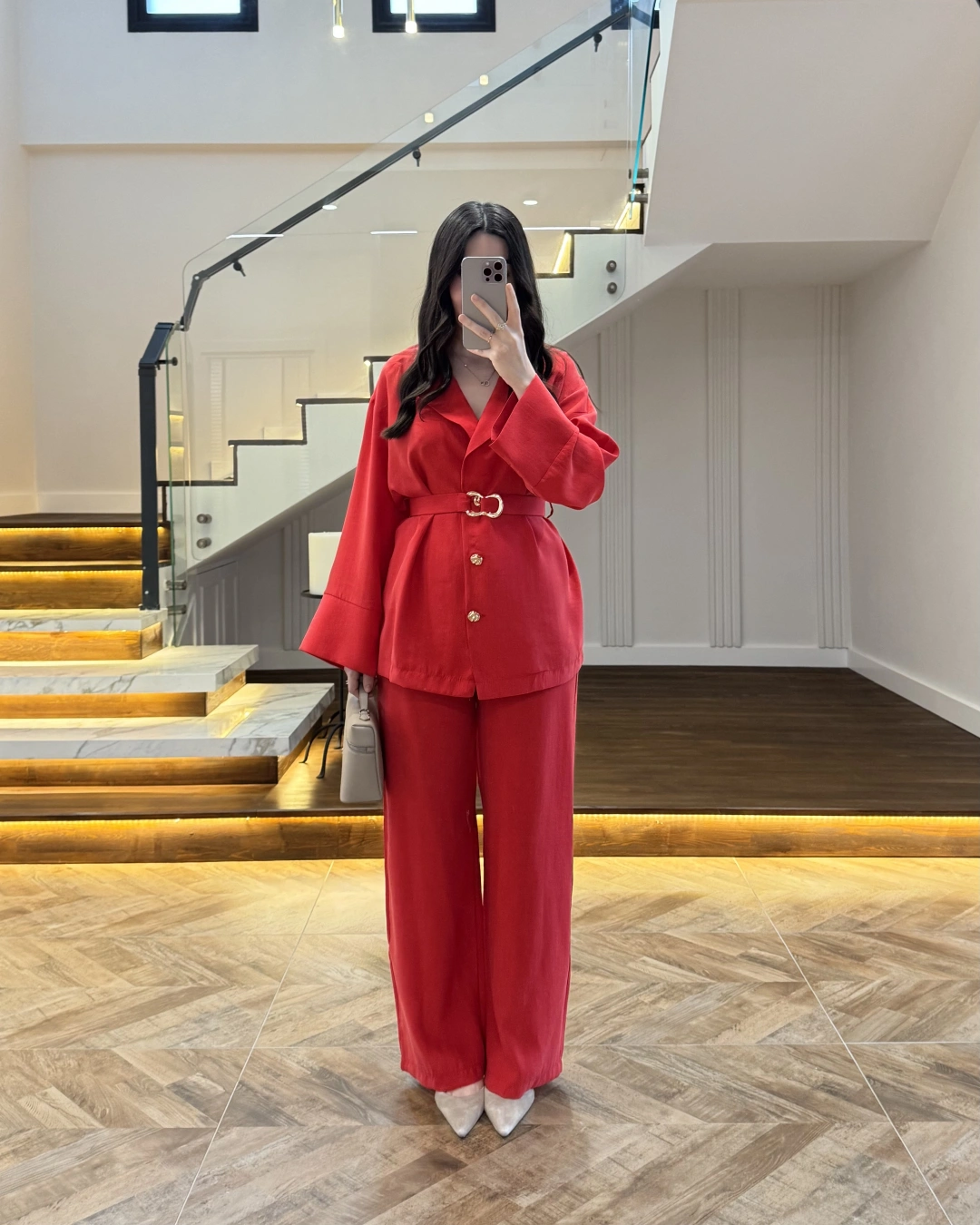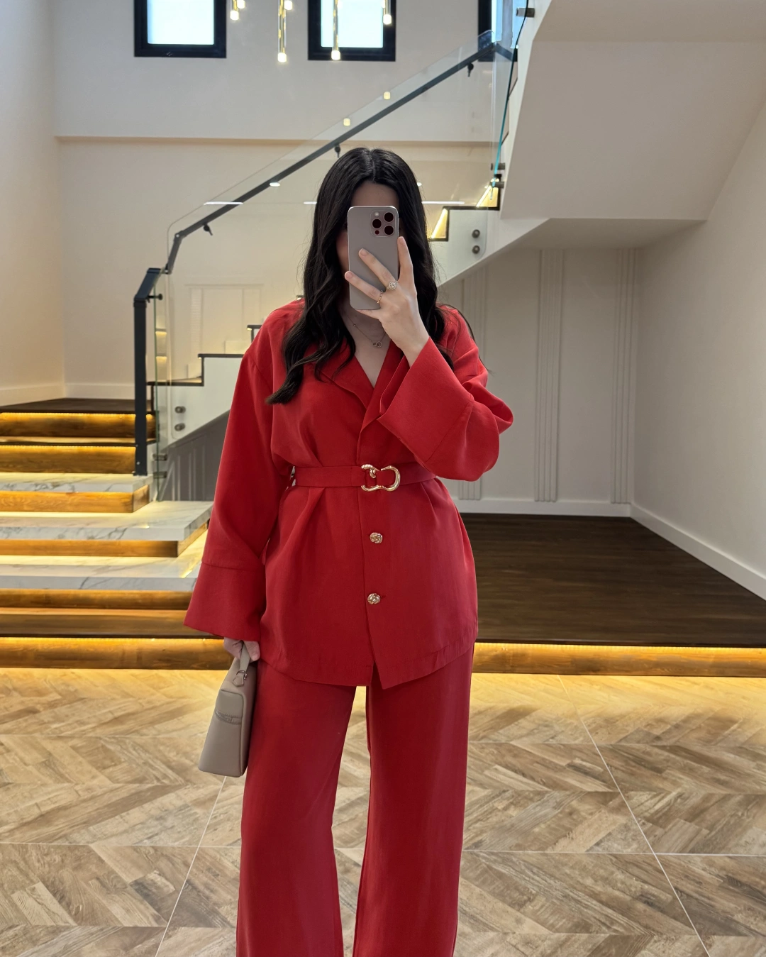 KIRMIZI TOKA DETAYLI TUNİK TAKIM -8927
