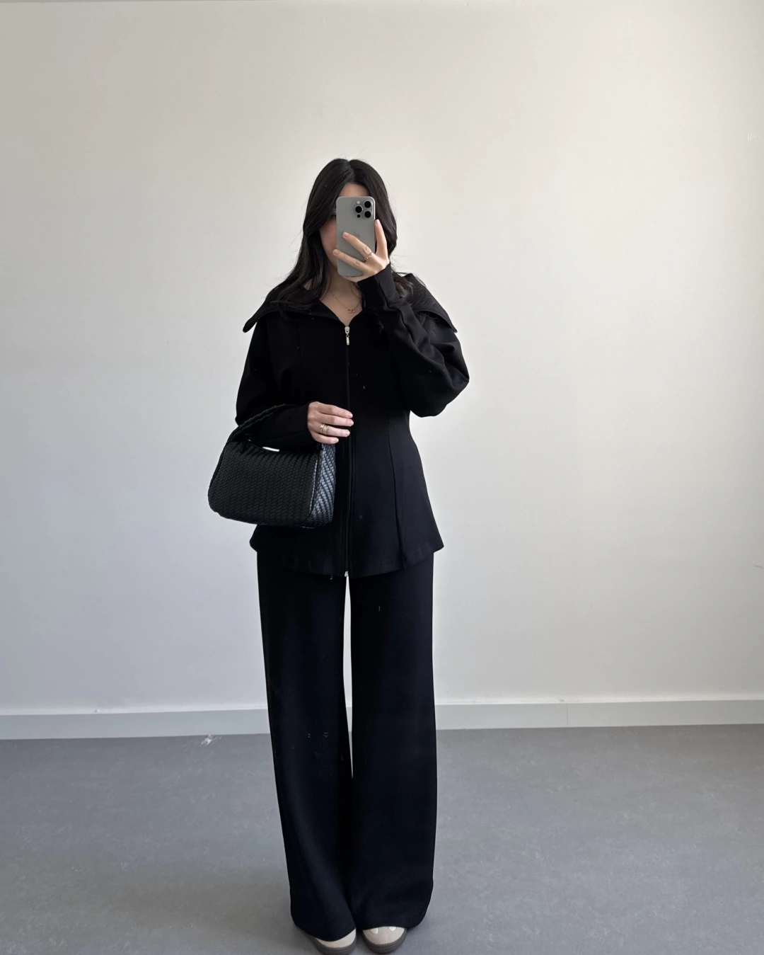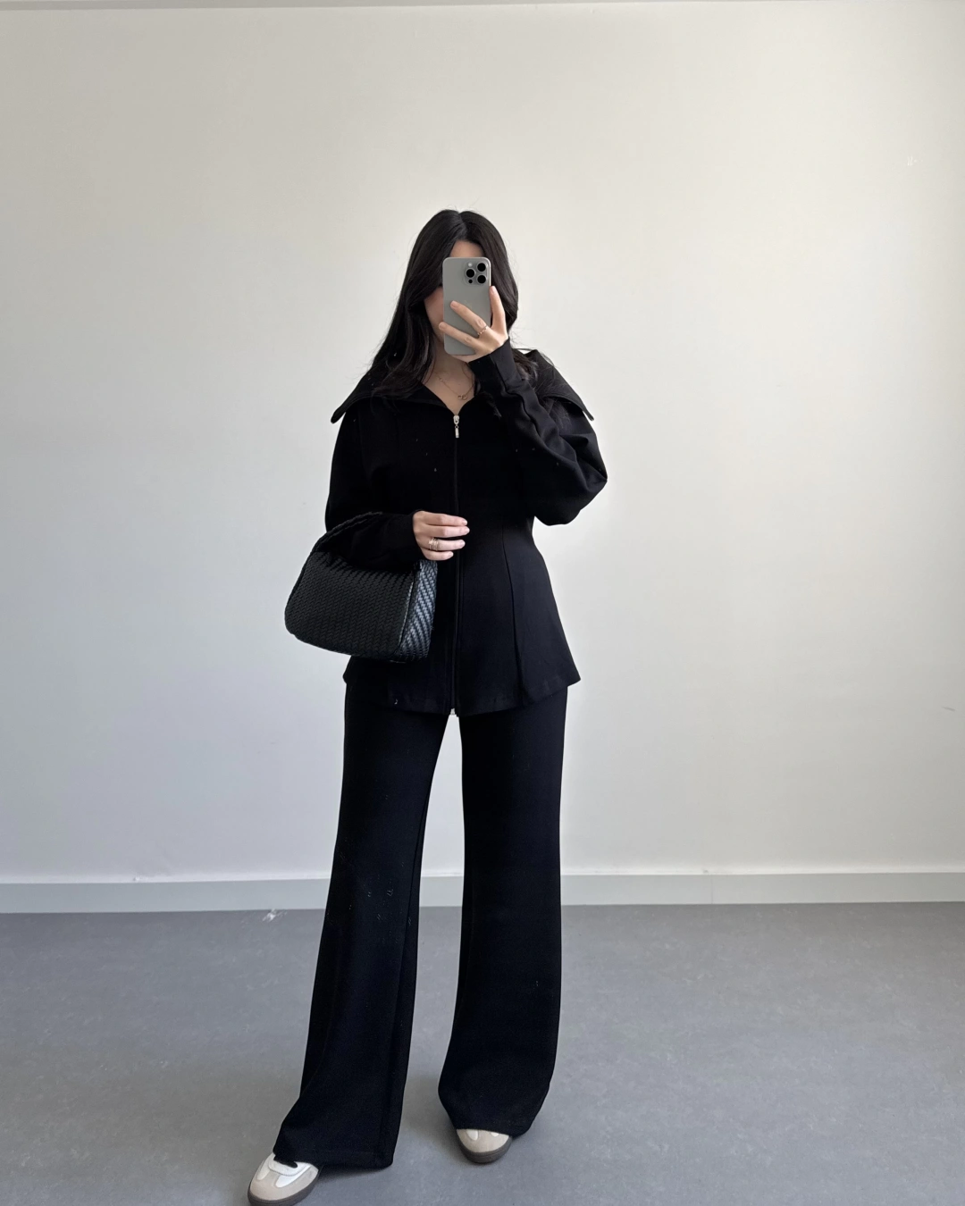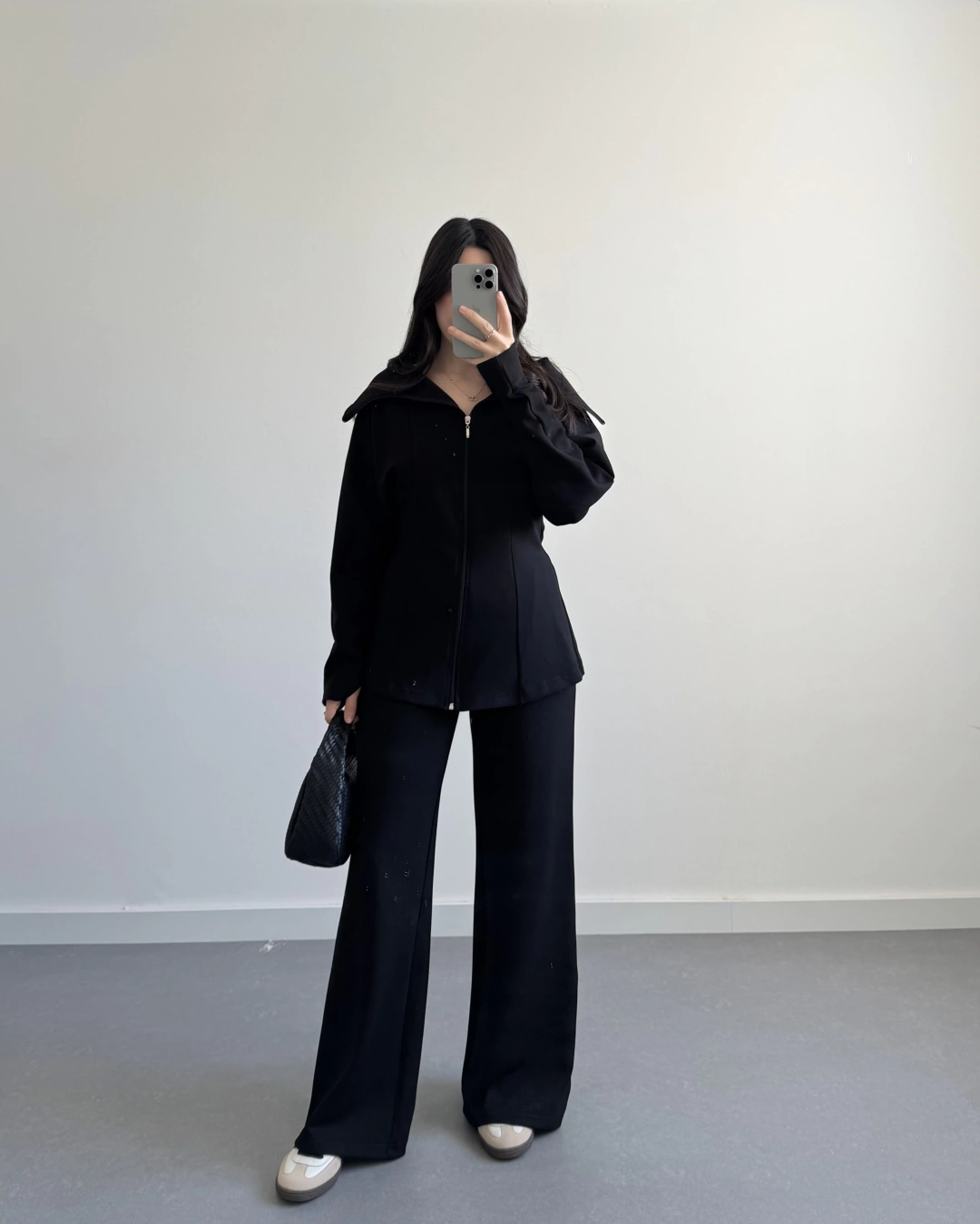 SİYAH BELİ KUŞAKLI PİLELİ MODAL TAKIM