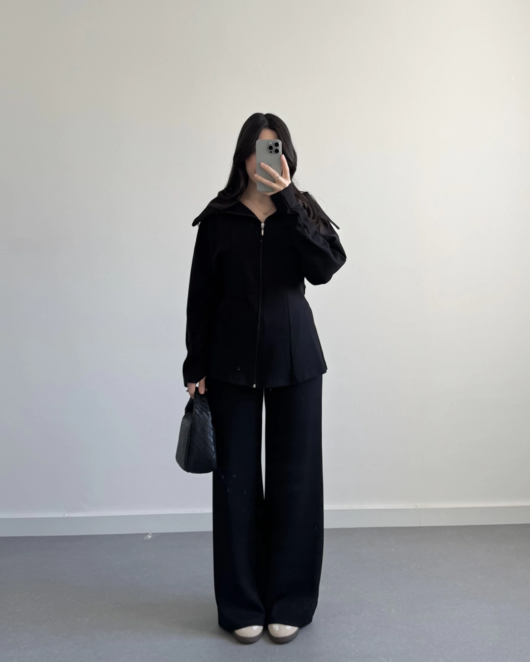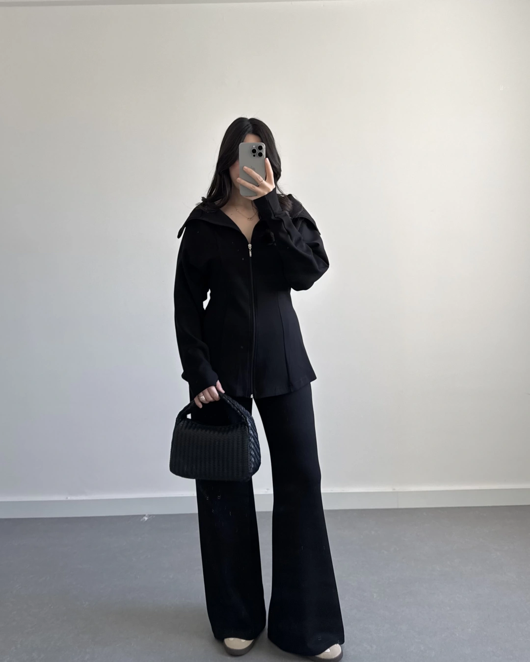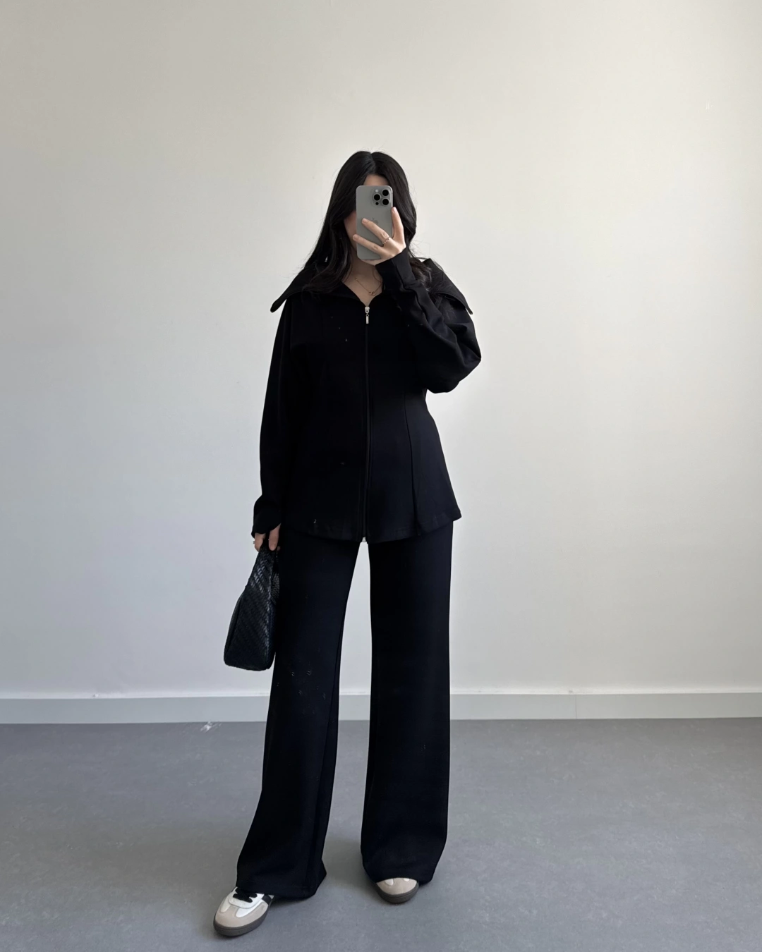 SİYAH BELİ KUŞAKLI PİLELİ MODAL TAKIM