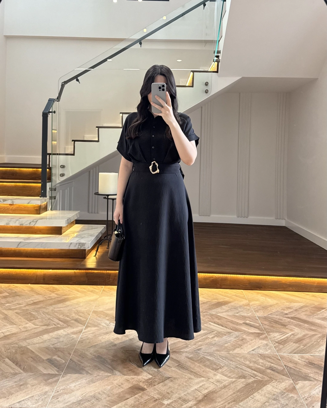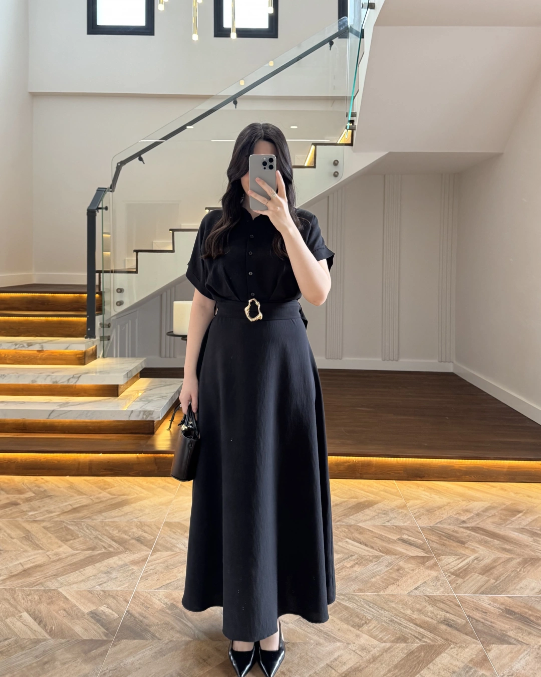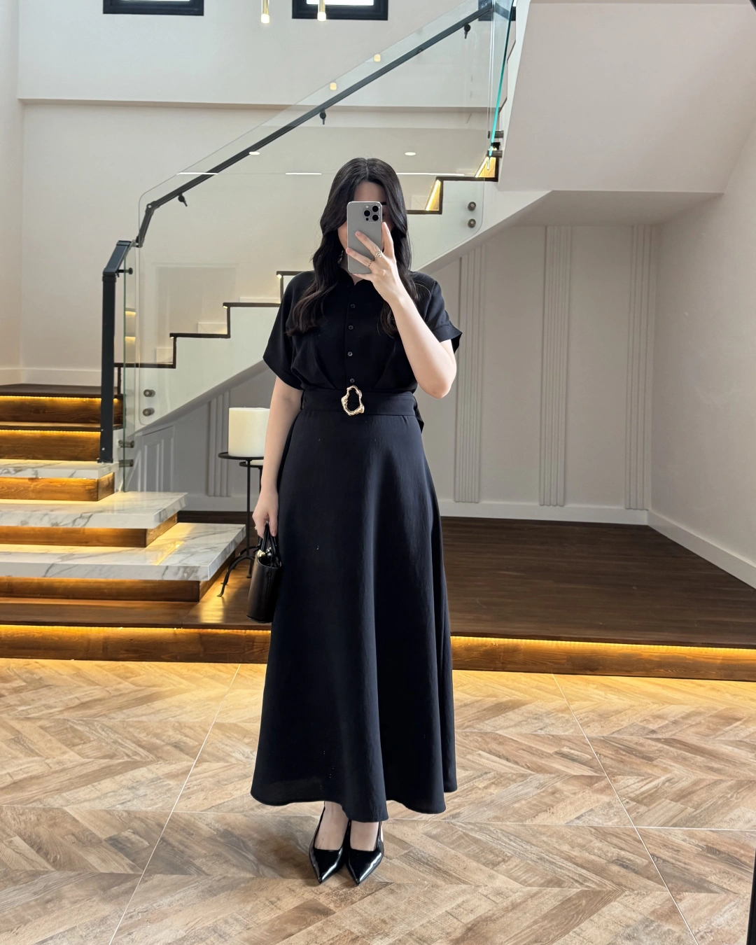 SİYAH GOLD KEMER DETAYLI VİSKON ELBİSE -2376