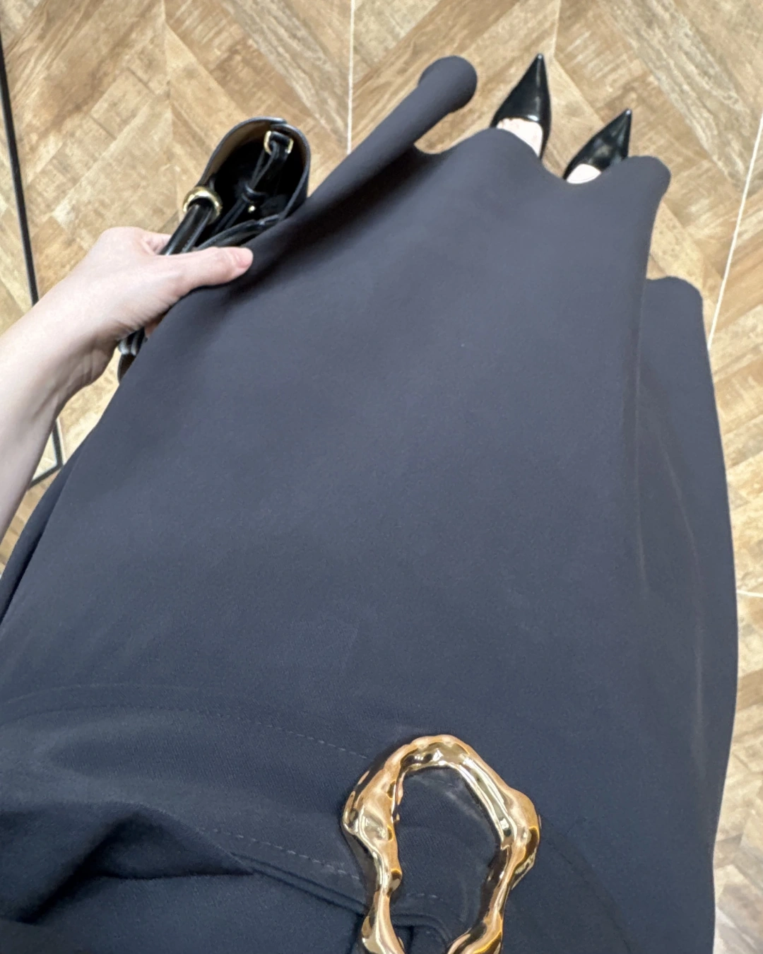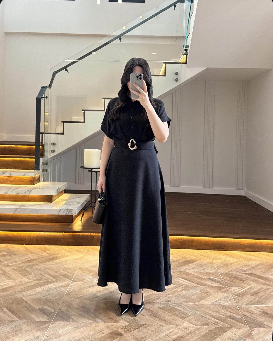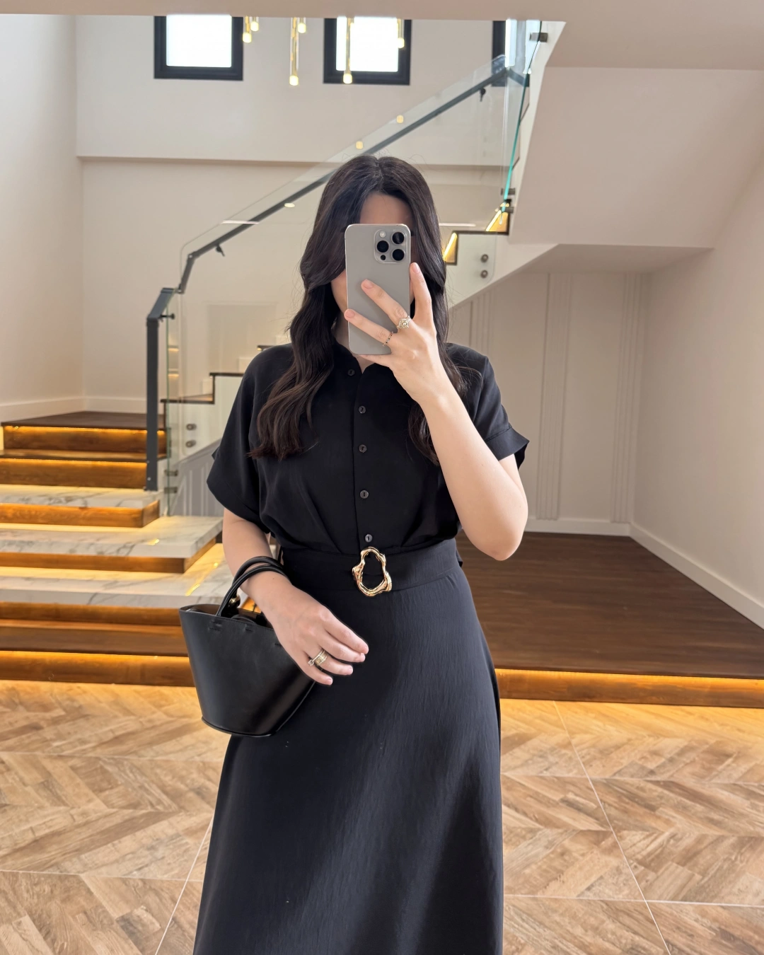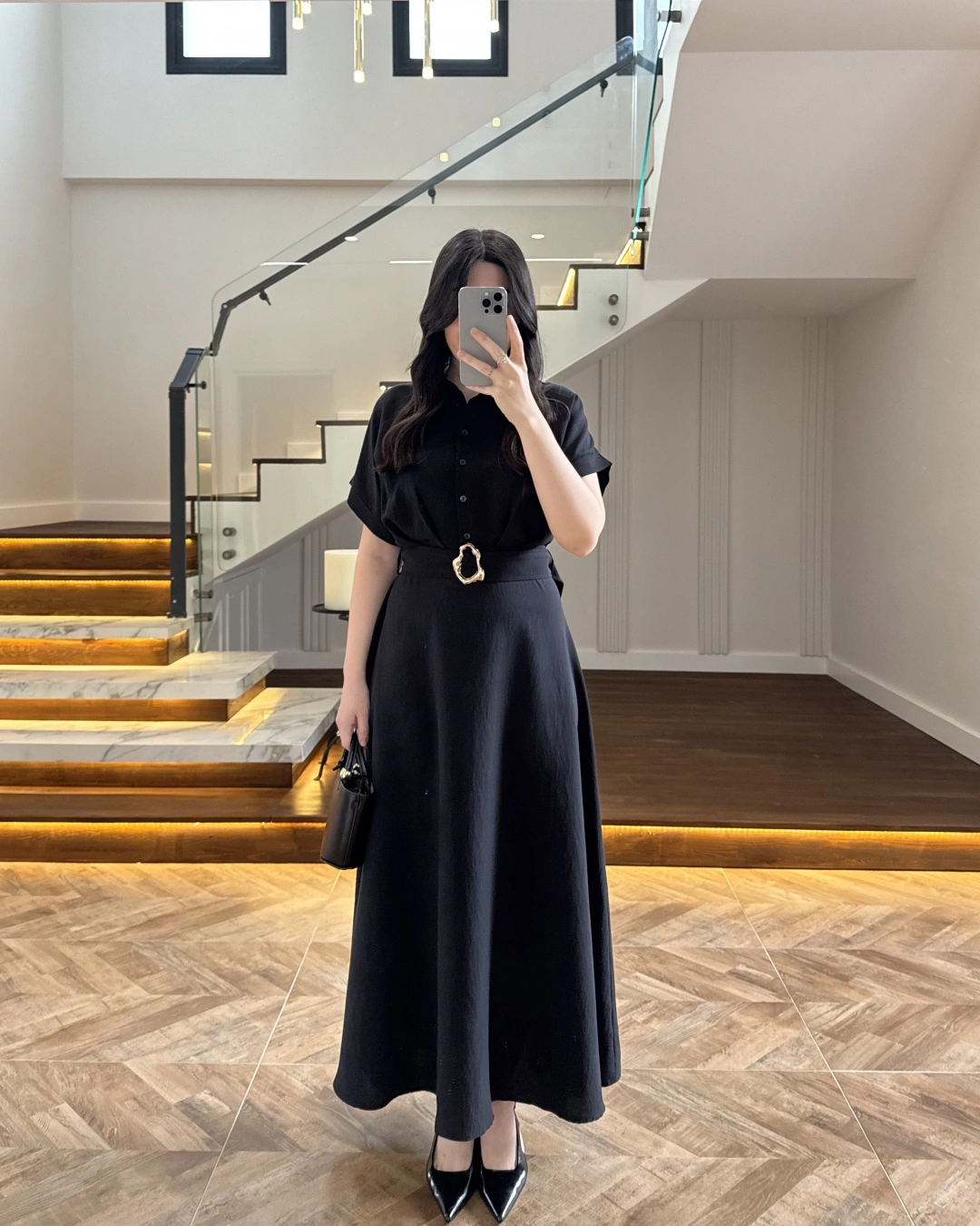 SİYAH GOLD KEMER DETAYLI VİSKON ELBİSE -2376